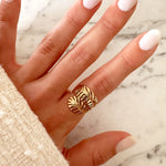 Bague en acier inoxydable composée de deux feuilles exotiques.