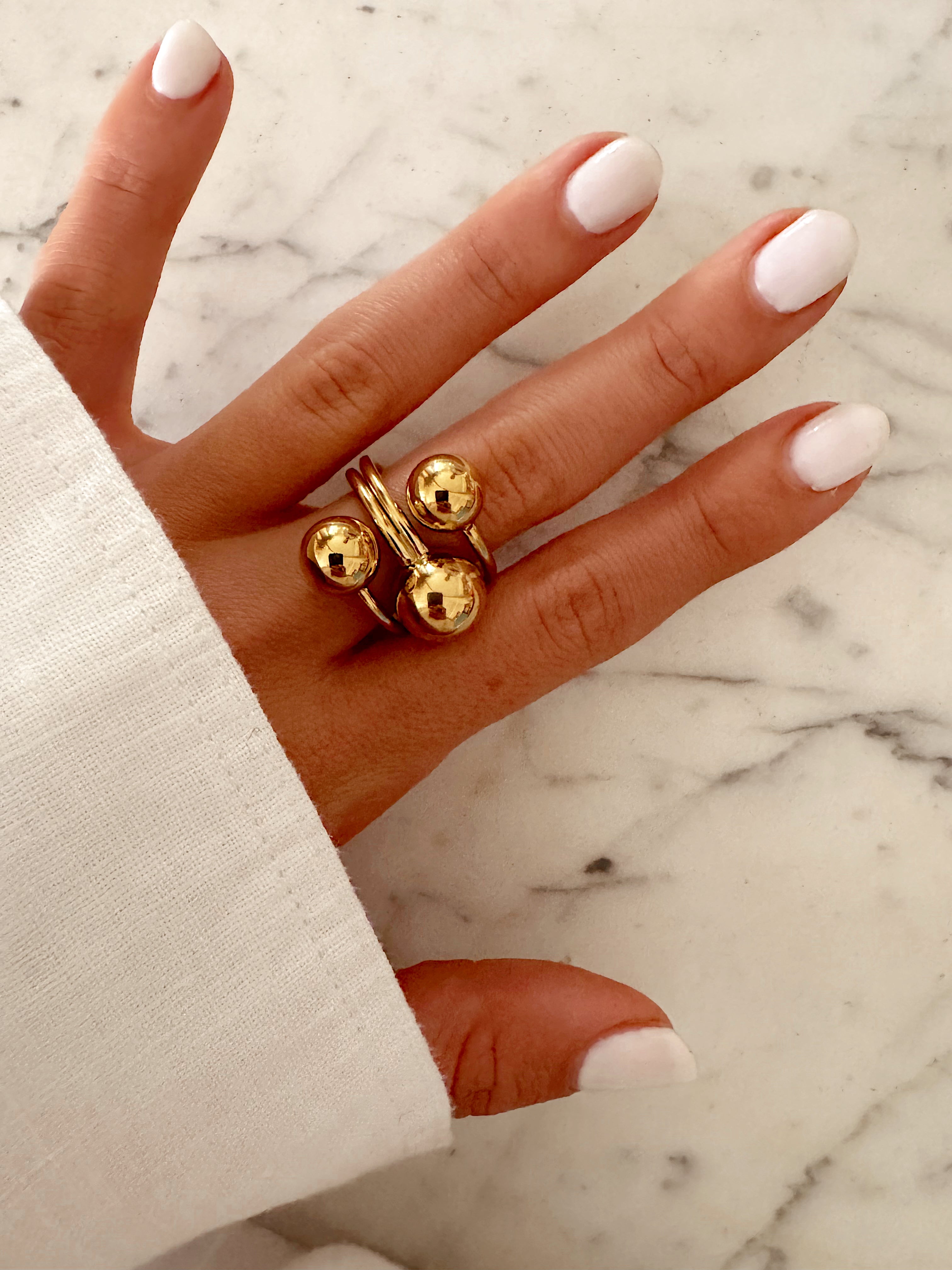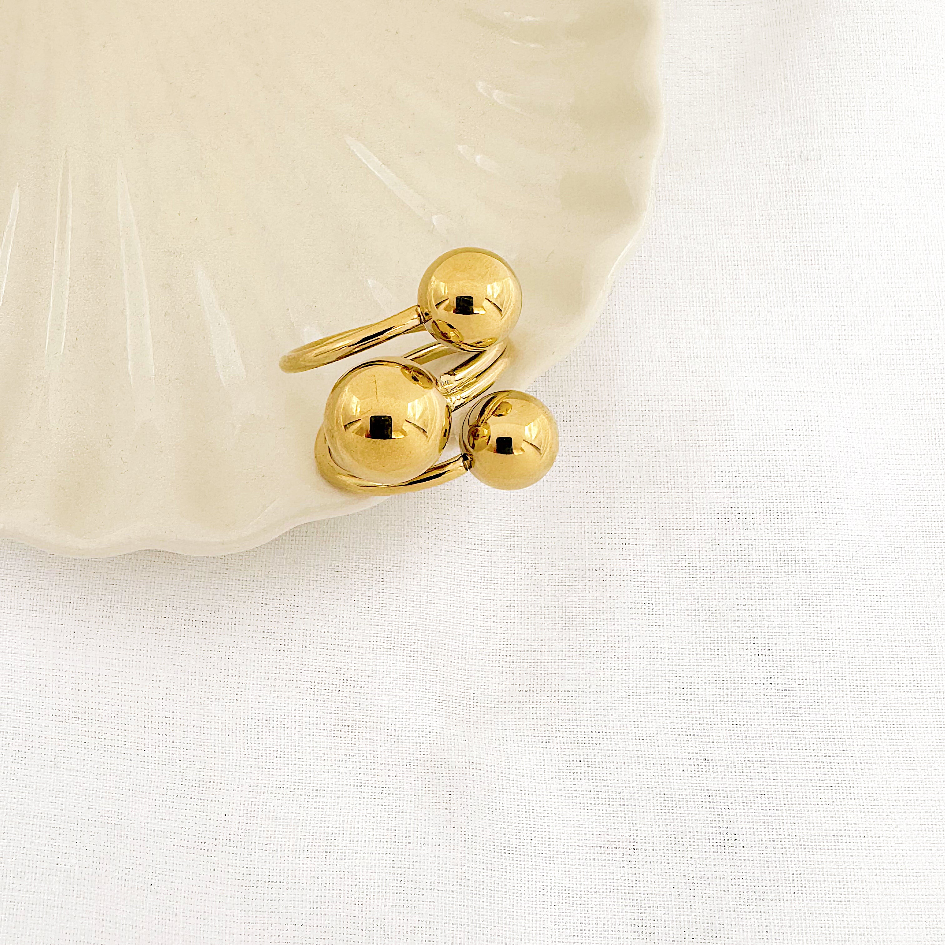 - Bague large en acier inoxydable composée de 3 rangs avec 3 boules miroir.