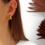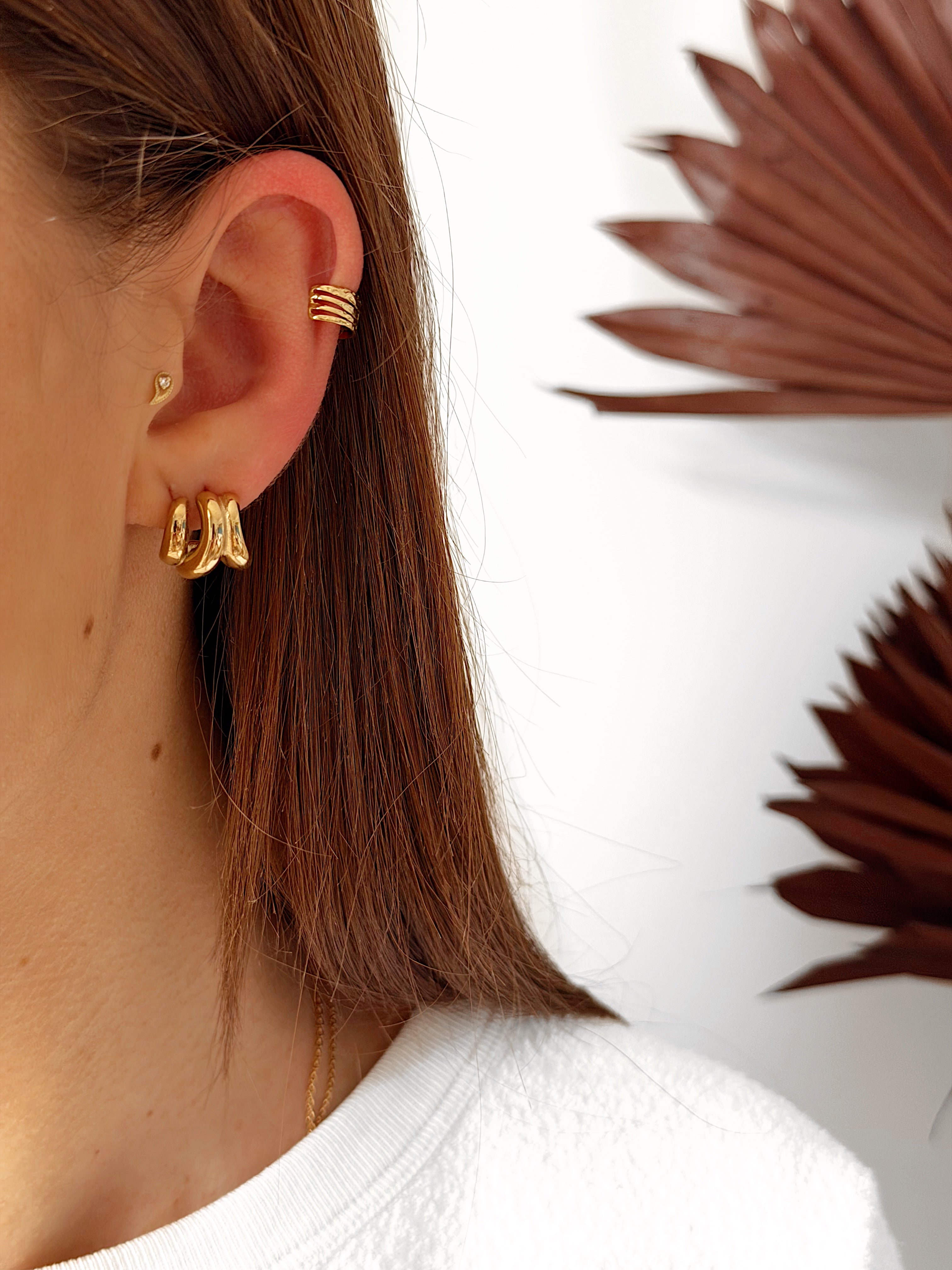 - Ear Cuff en acier inoxydable doré ornées de lignes ajourées et de motifs texturés.