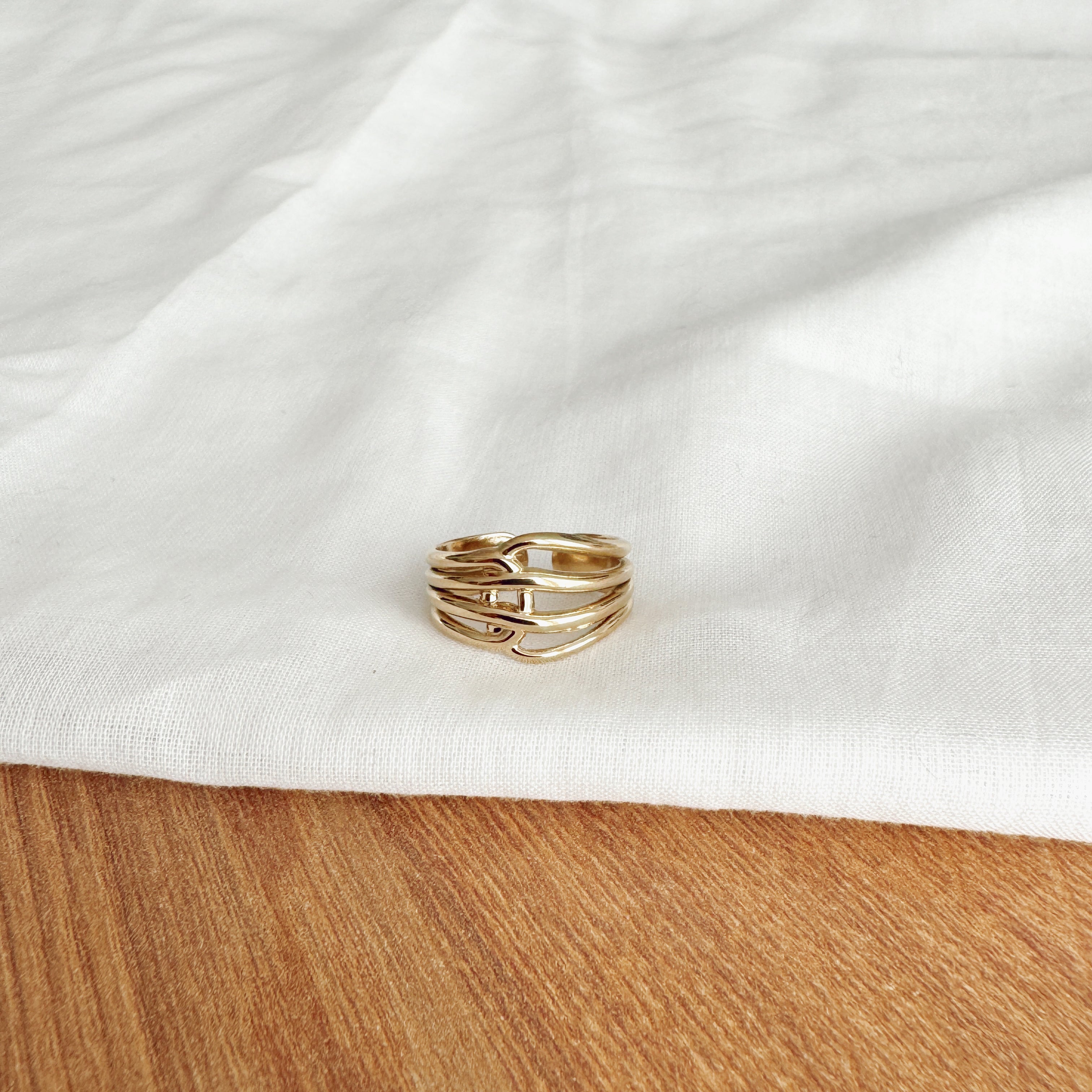 - Bague en acier inoxydable doré composée de lignes ajourées entrecroisées.