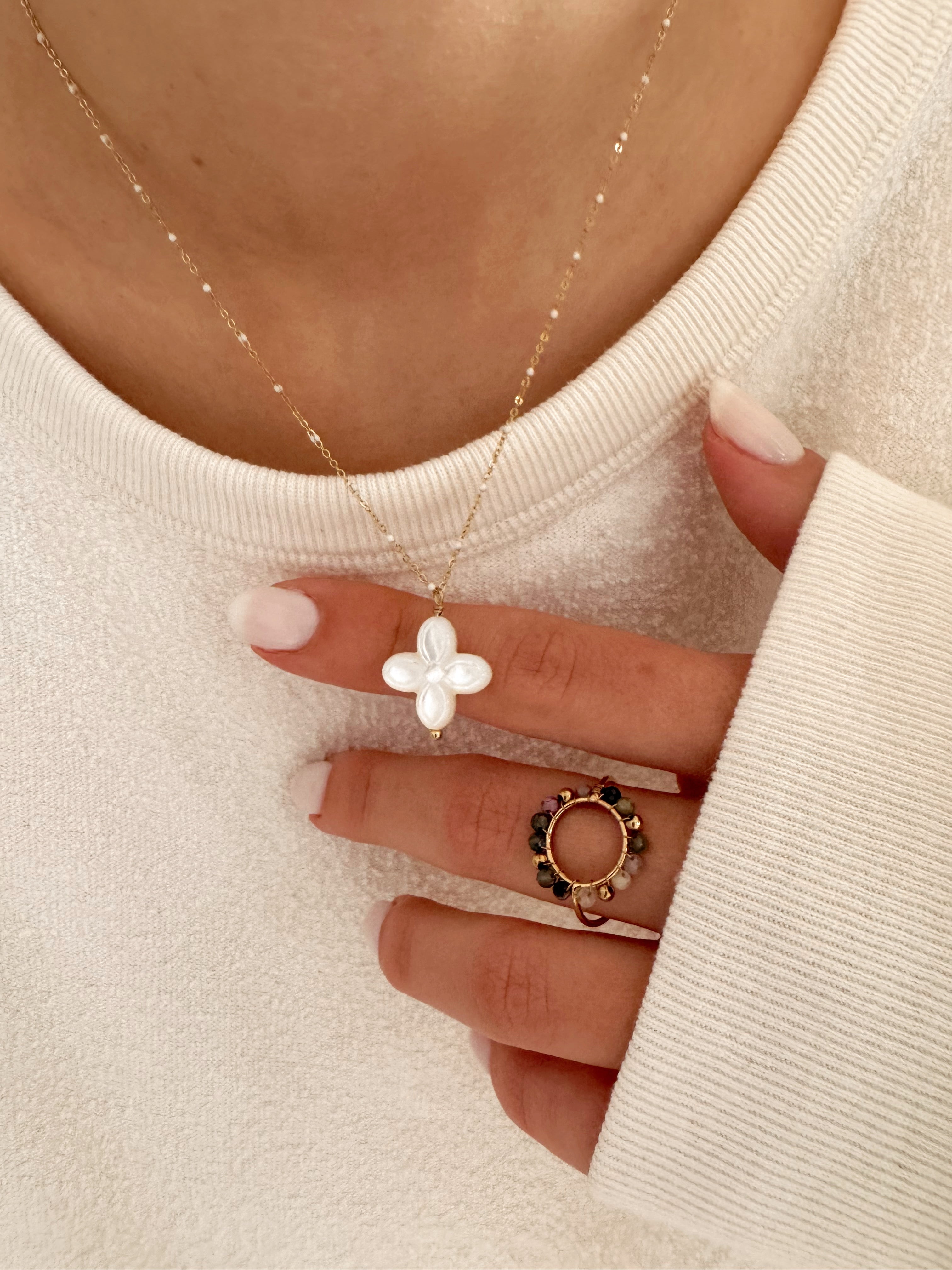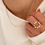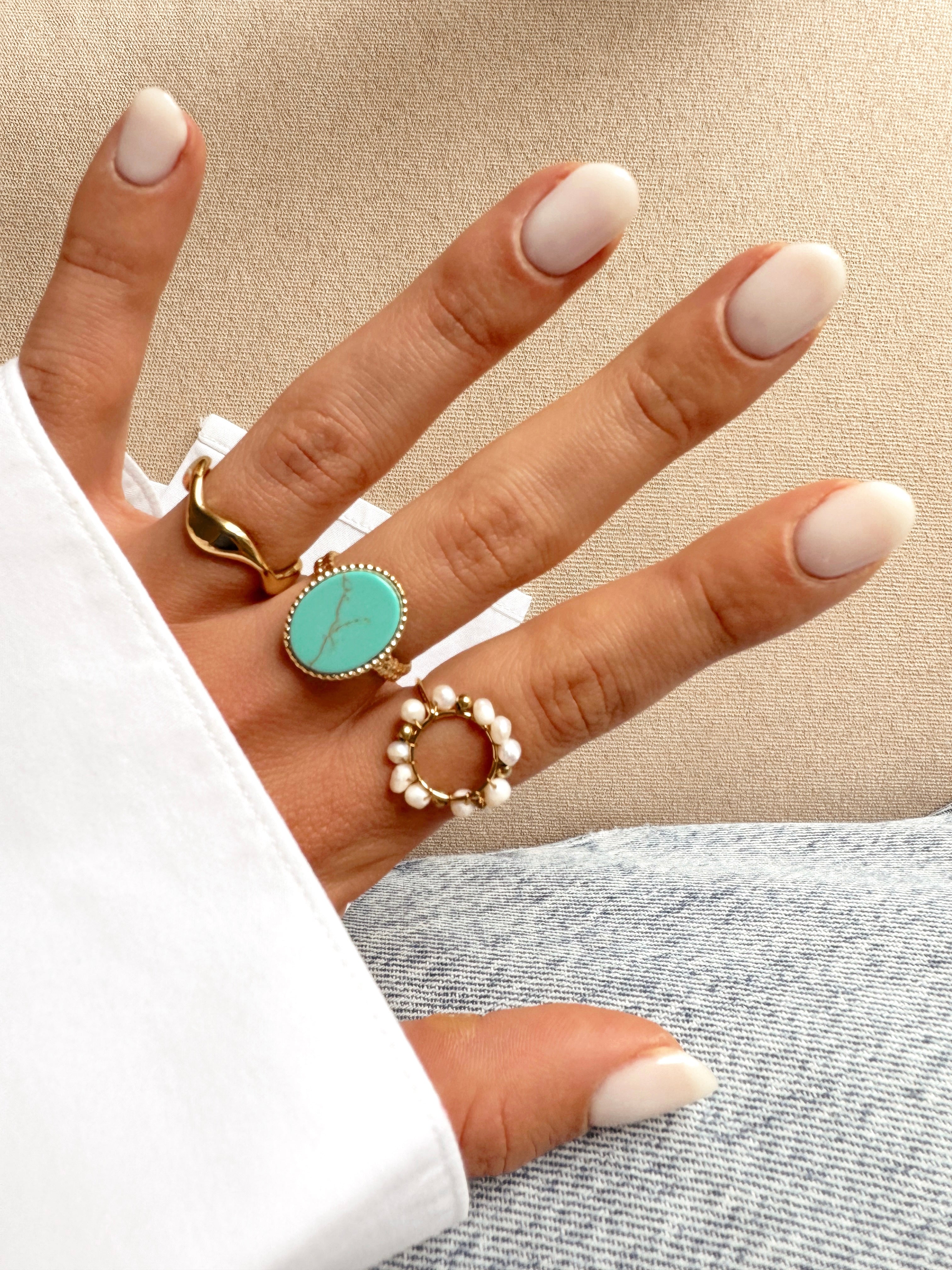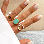 - Bague fine en acier inoxydable composée d'un anneau en forme de cercle, sertie de perles en acier inoxydable et de petites pierres naturelles.