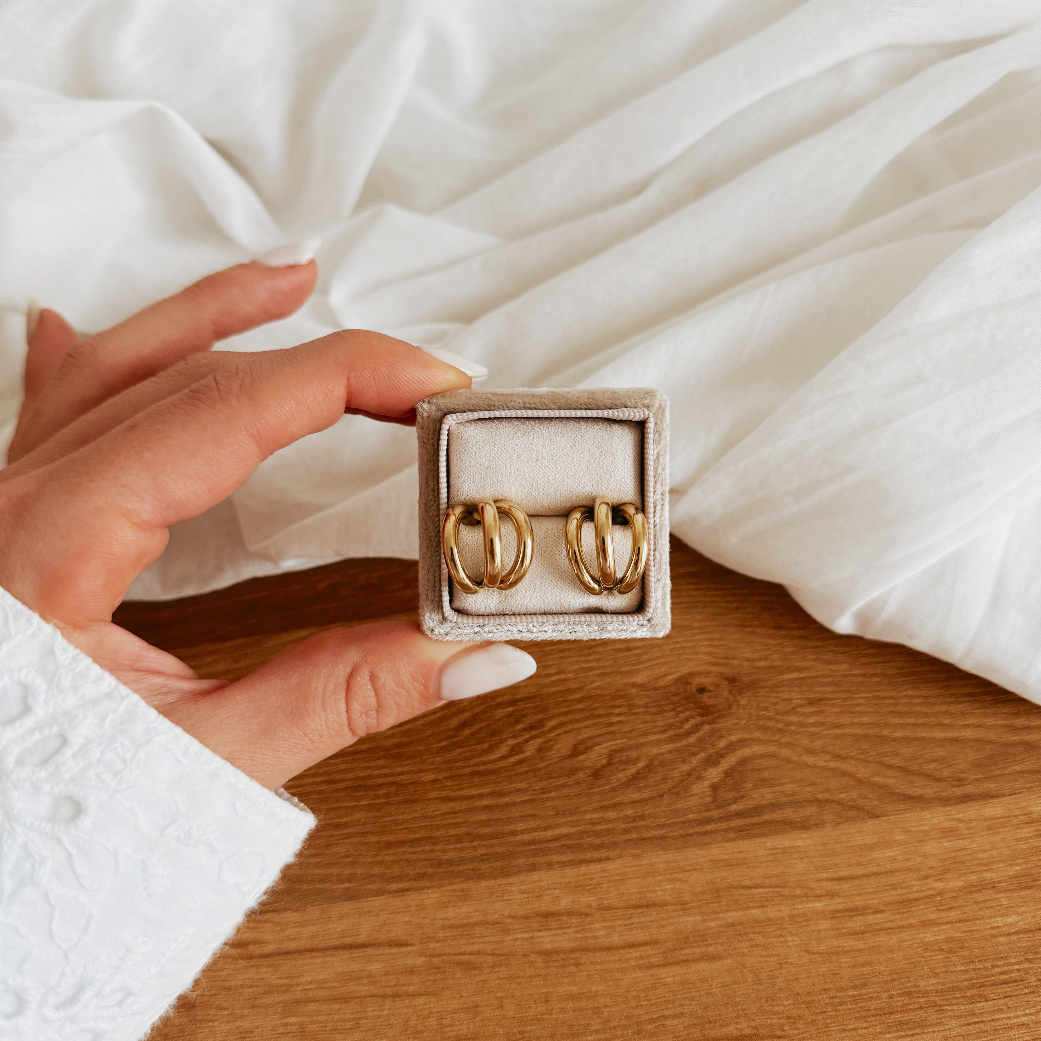 - Boucles d'oreilles type créoles en acier inoxydable doré avec 3 anneaux lisses.