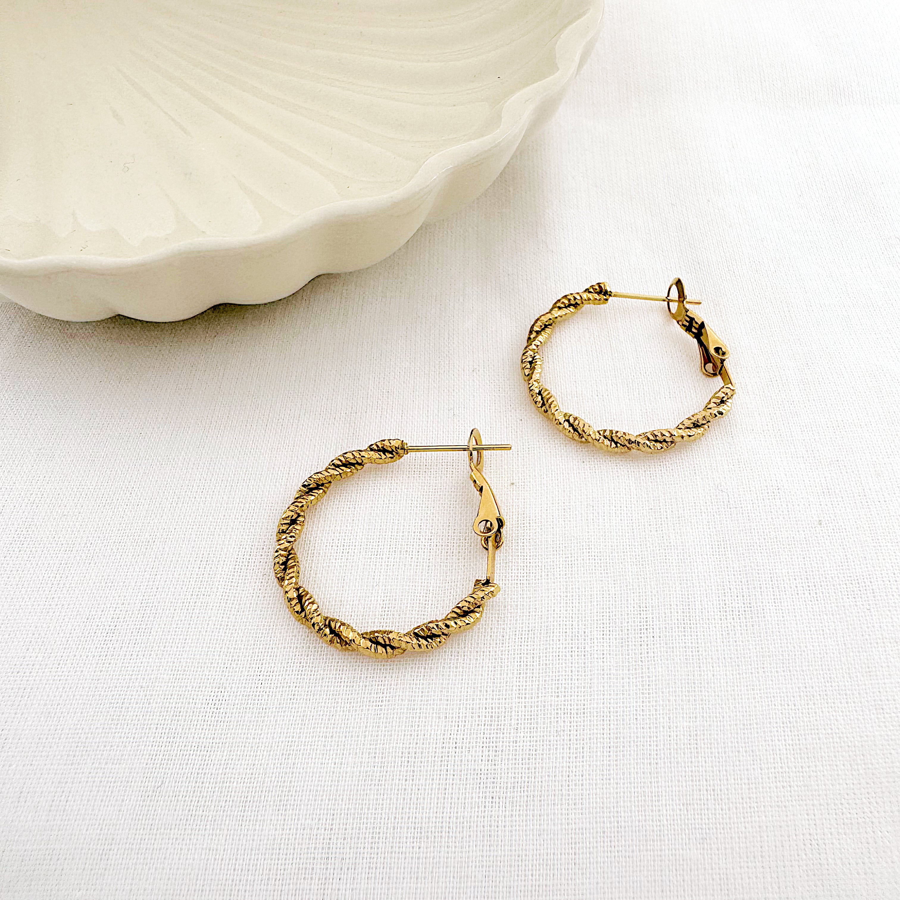 - Boucles d'oreilles type créoles en acier inoxydable composées d'un effet torsadé et texturé.