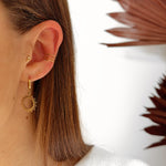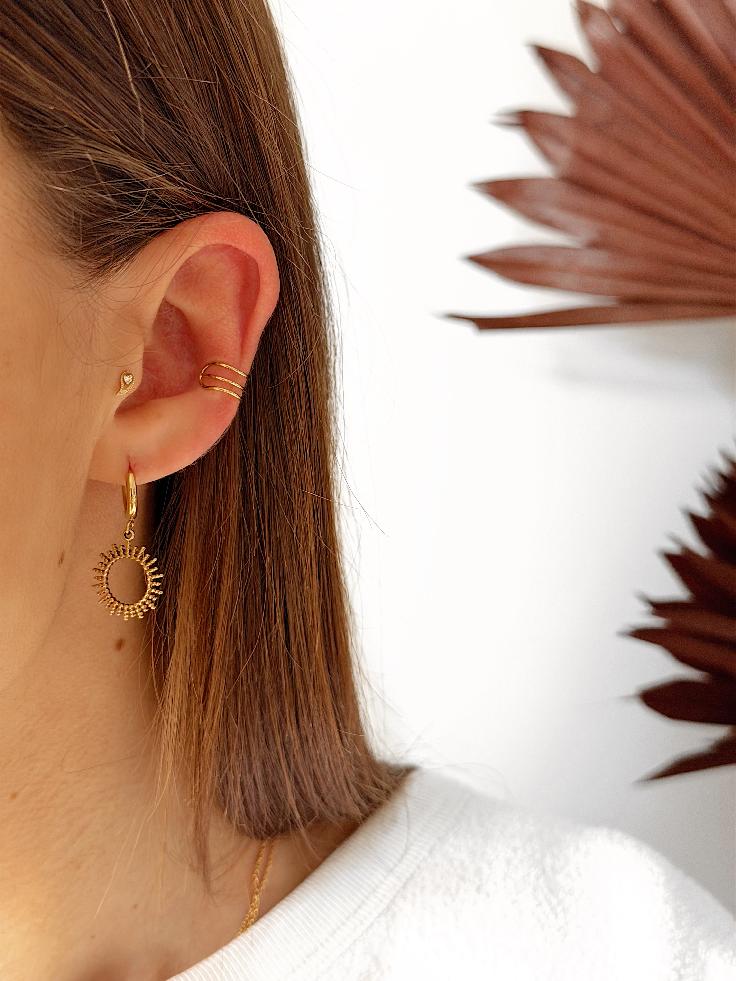 - Boucles d'oreilles type créoles avec fermoir à charnière en acier inoxydable composées d'un soleil ajouré.