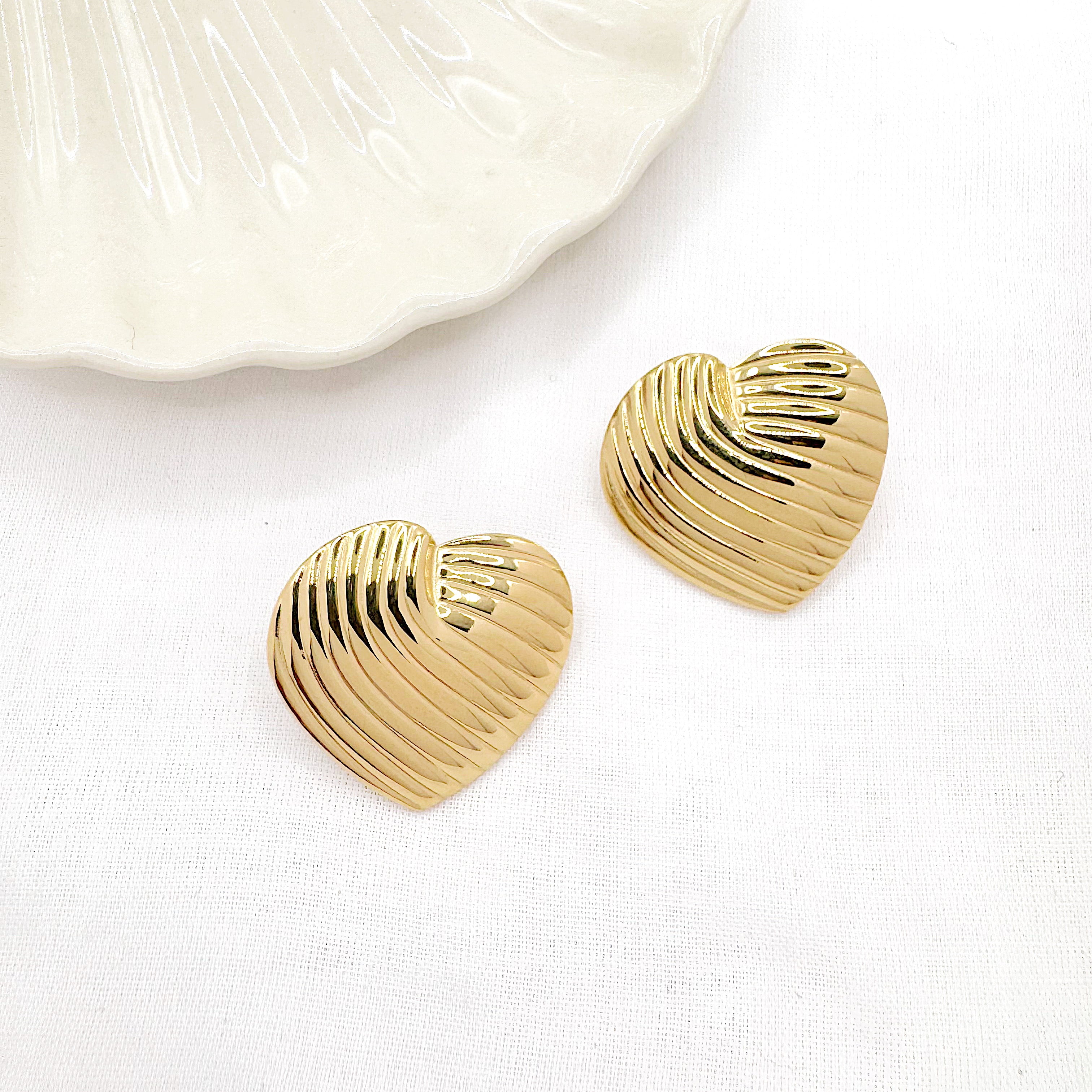 - Boucles d'oreilles à puce en acier inoxydable doré composées d'un gros coeur strié.