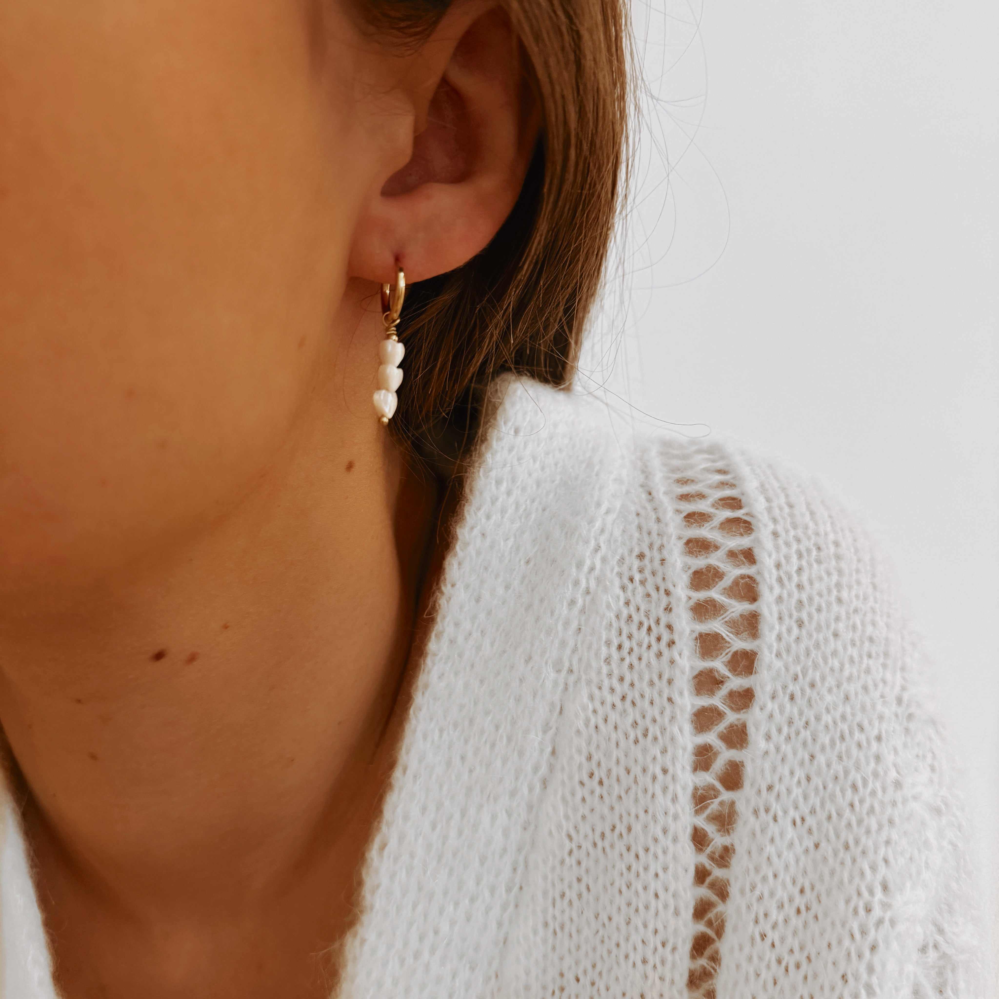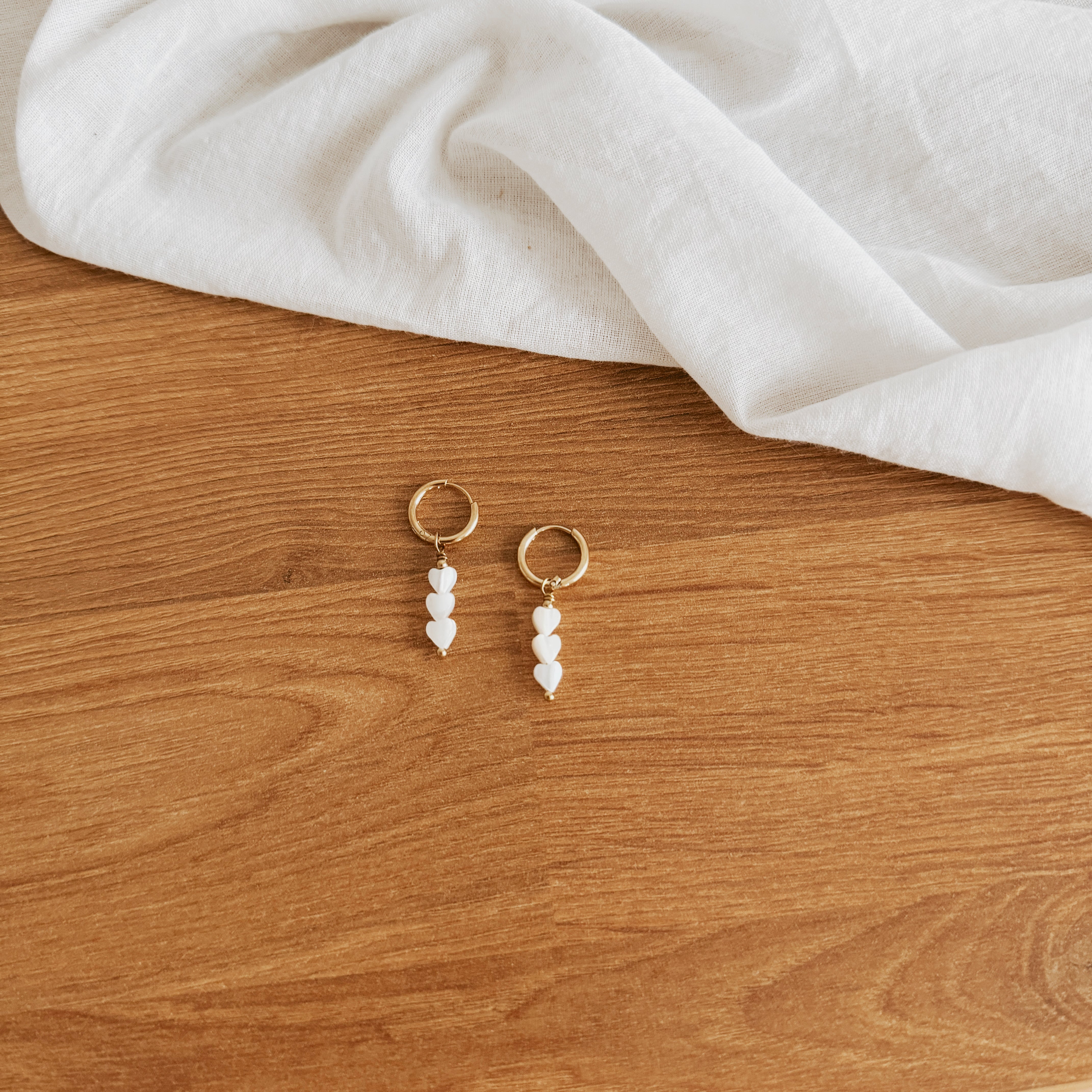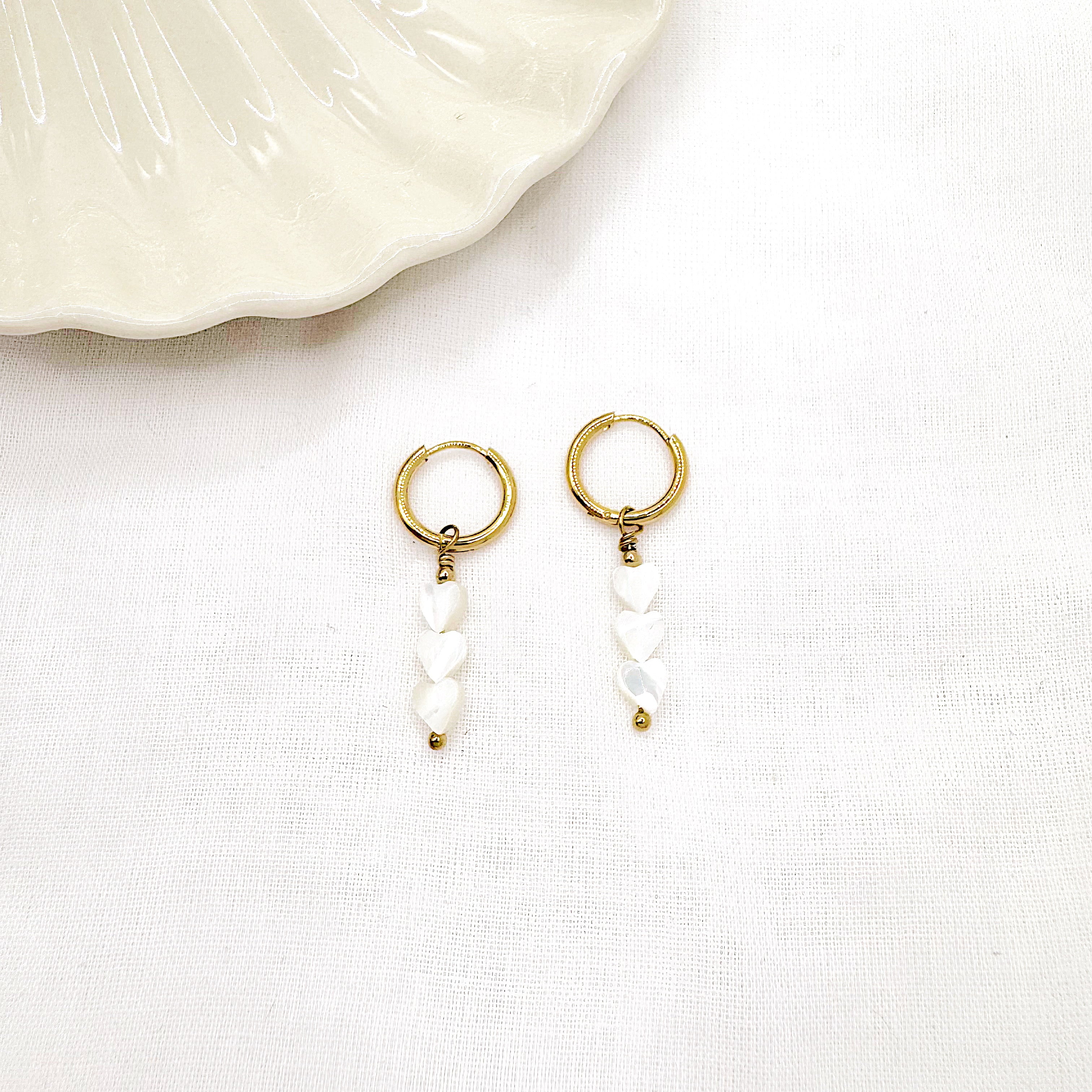 - Boucles d'oreilles type créoles avec fermoir à charnière en acier inoxydable composées d'un pendentif en forme de 3 petits coeurs en perle nacrée.