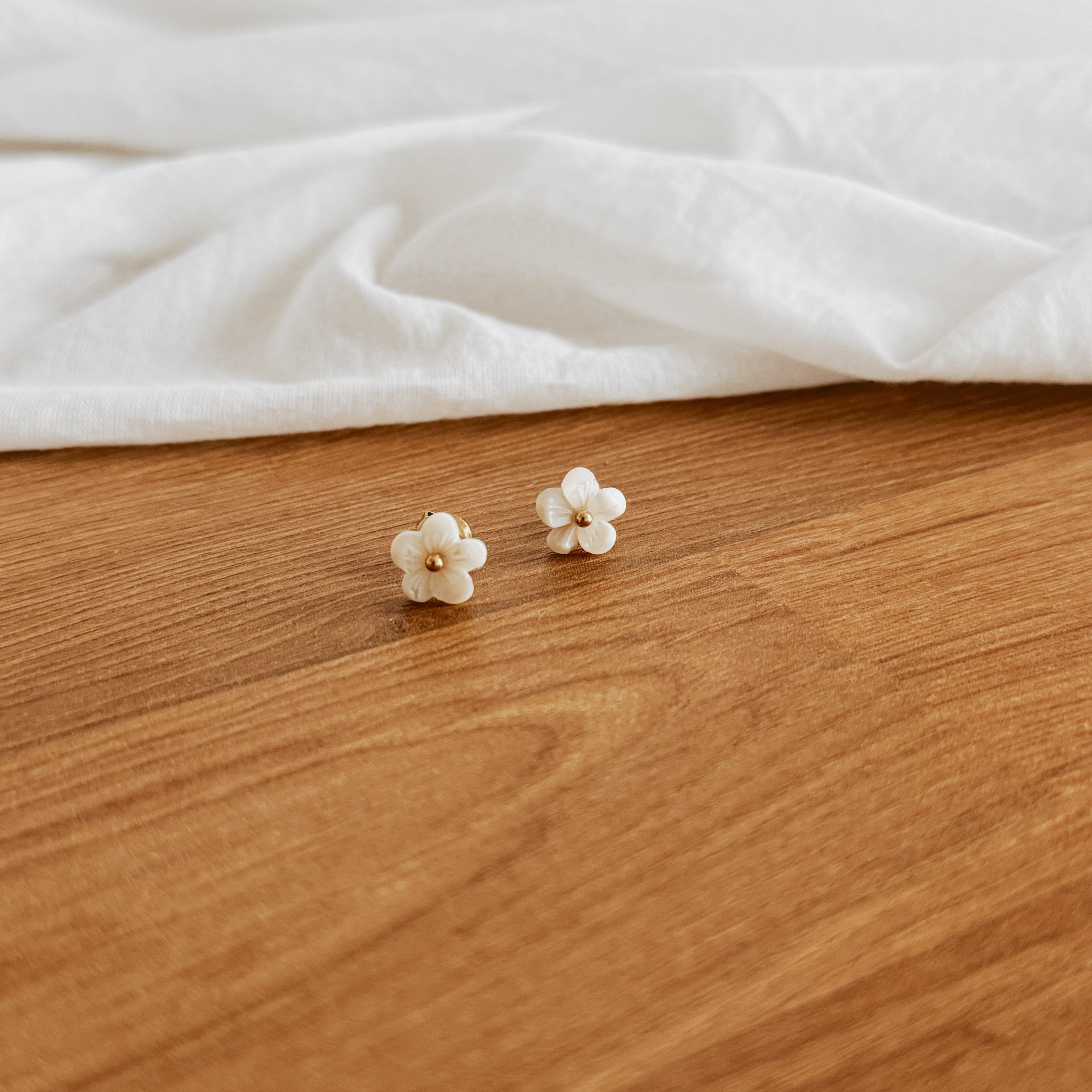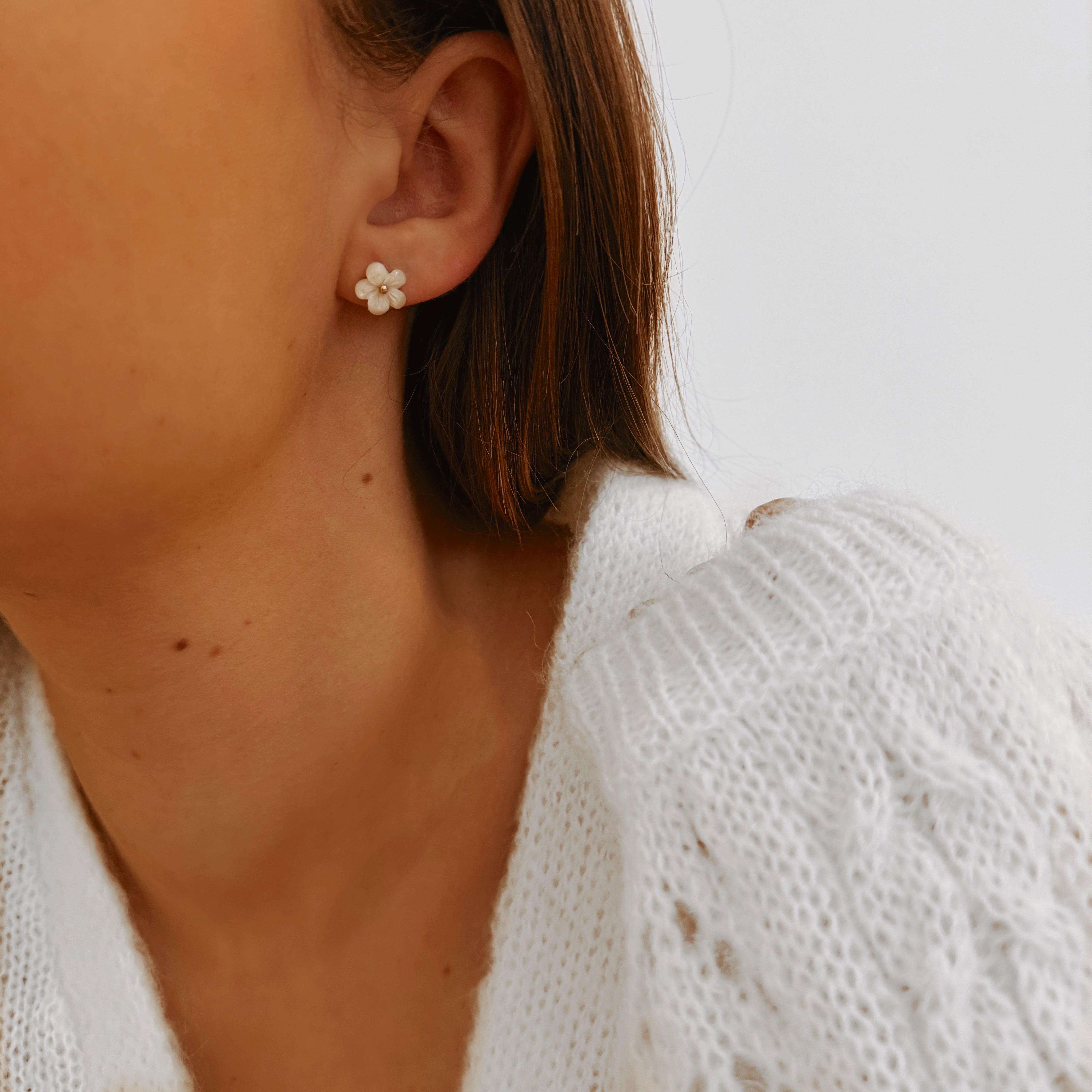 - Boucles d'oreilles puce en acier inoxydable doré composées d'une petite fleur nacrée.