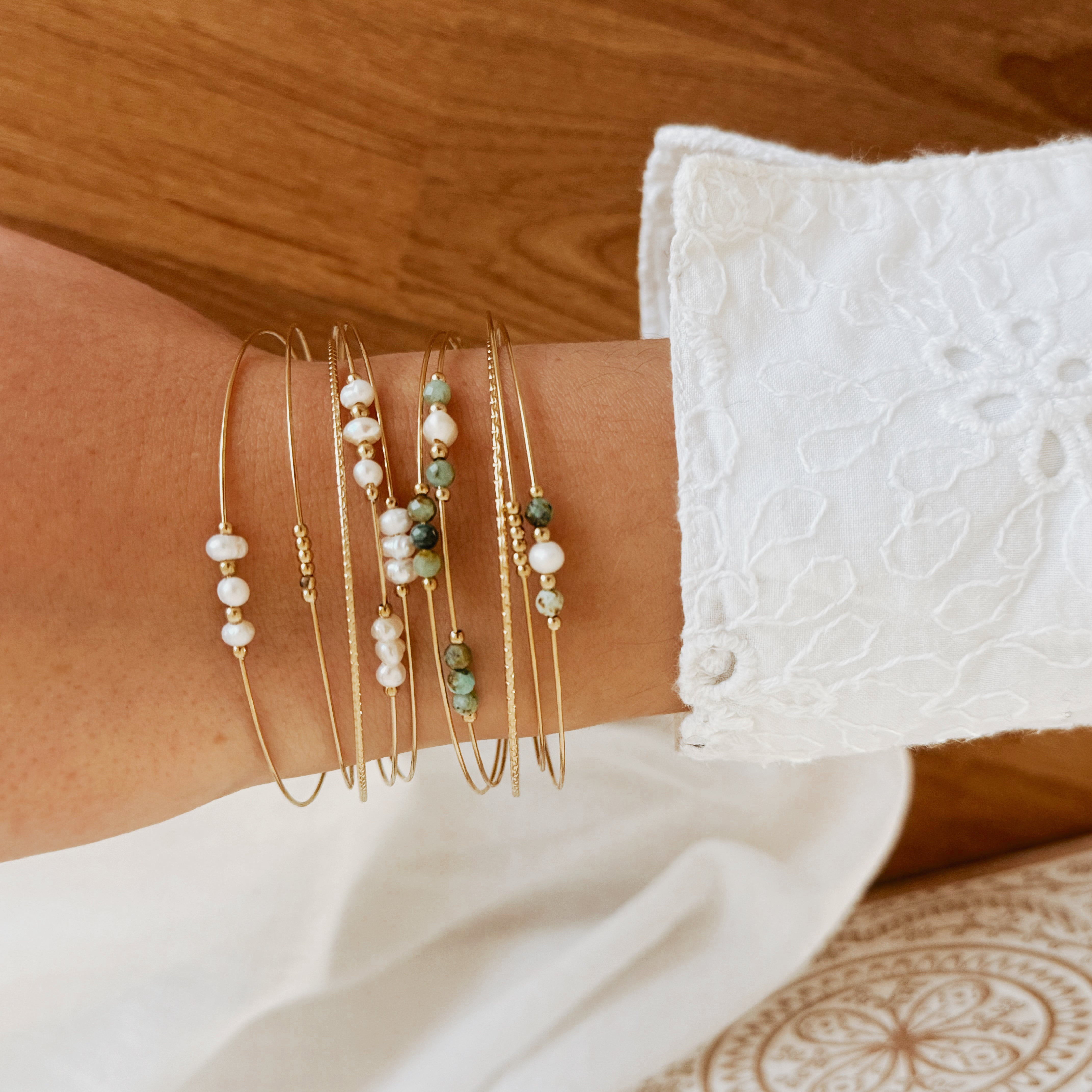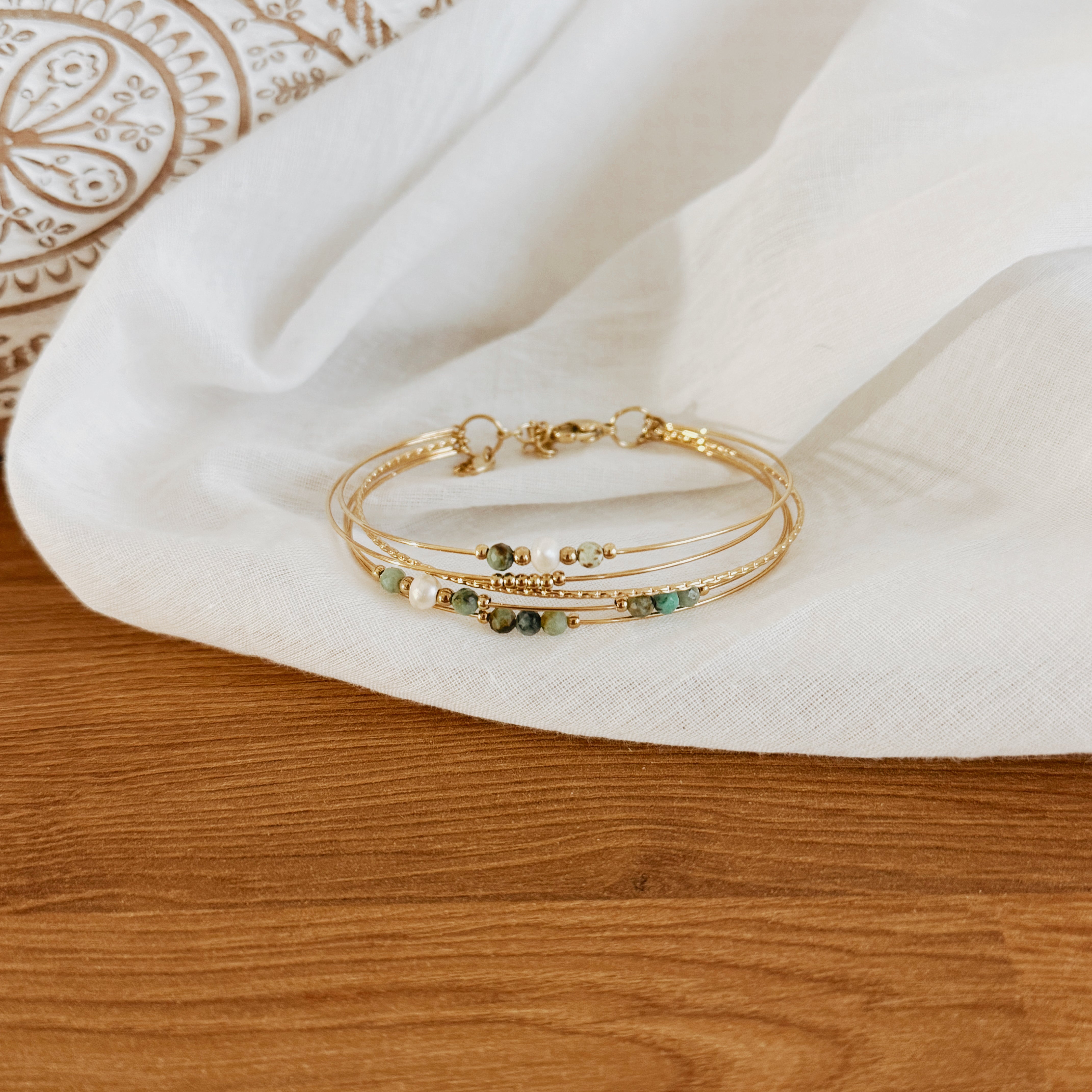 Bracelet jonc en acier inoxydable doré composé de 5 anneaux dentelées, serti de pierres naturelles et de perles en acier inoxydable dorés.