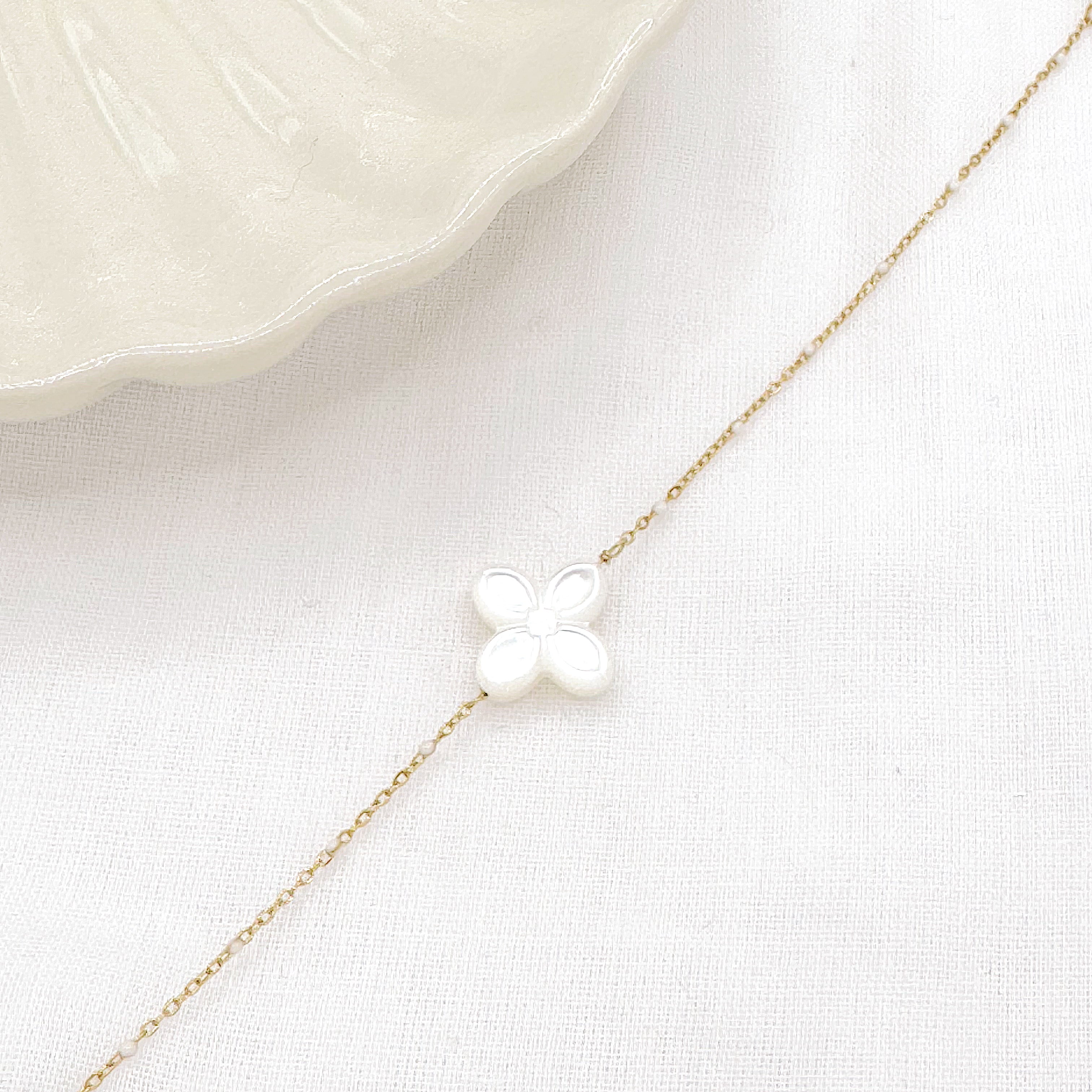 - Bracelet sur chaîne en acier inoxydable composé d'une chaîne aux touches émaillées et d'un pendentif en forme de trèfle nacré.