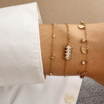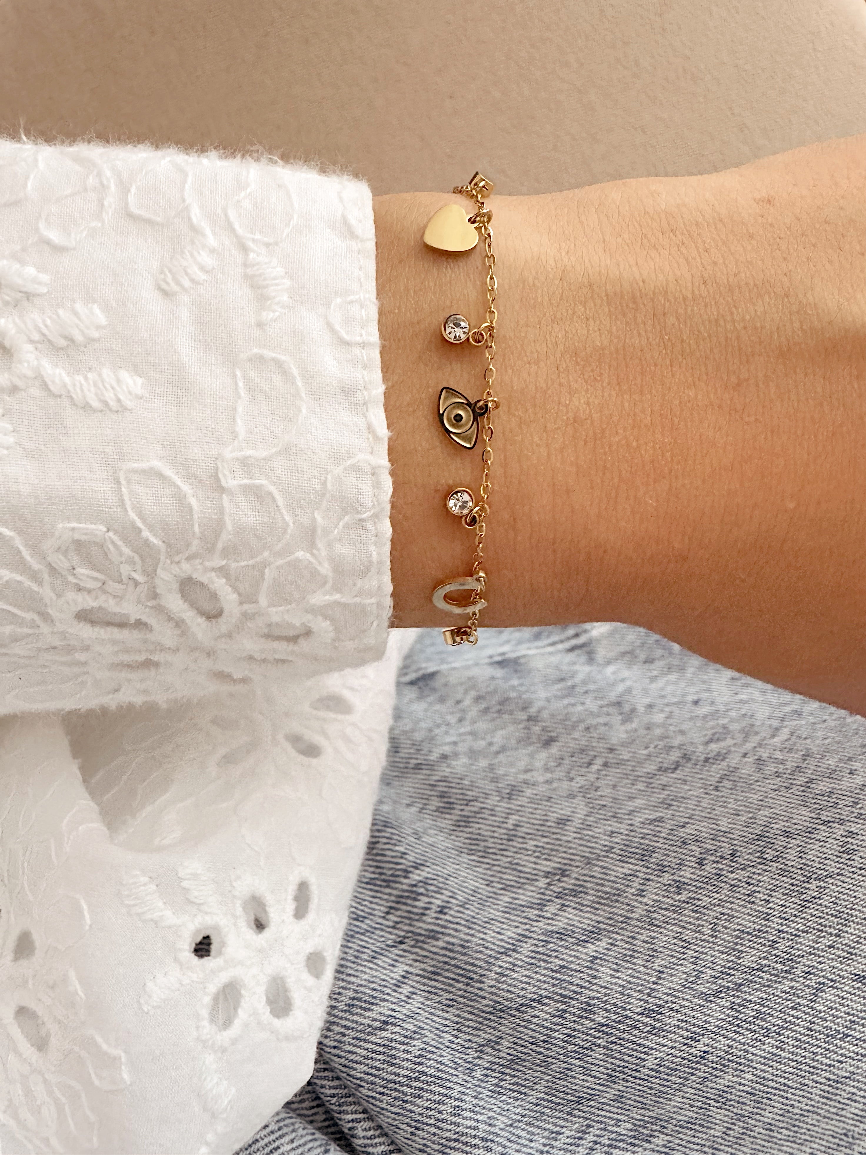 - Bracelet sur chaîne en acier inoxydable composé de pastilles en forme de plusieurs symboles porte bonheur (main, fer à cheval, oeil, coeur et wishbone) et de cristaux taillés.