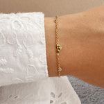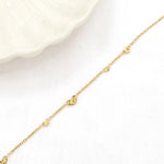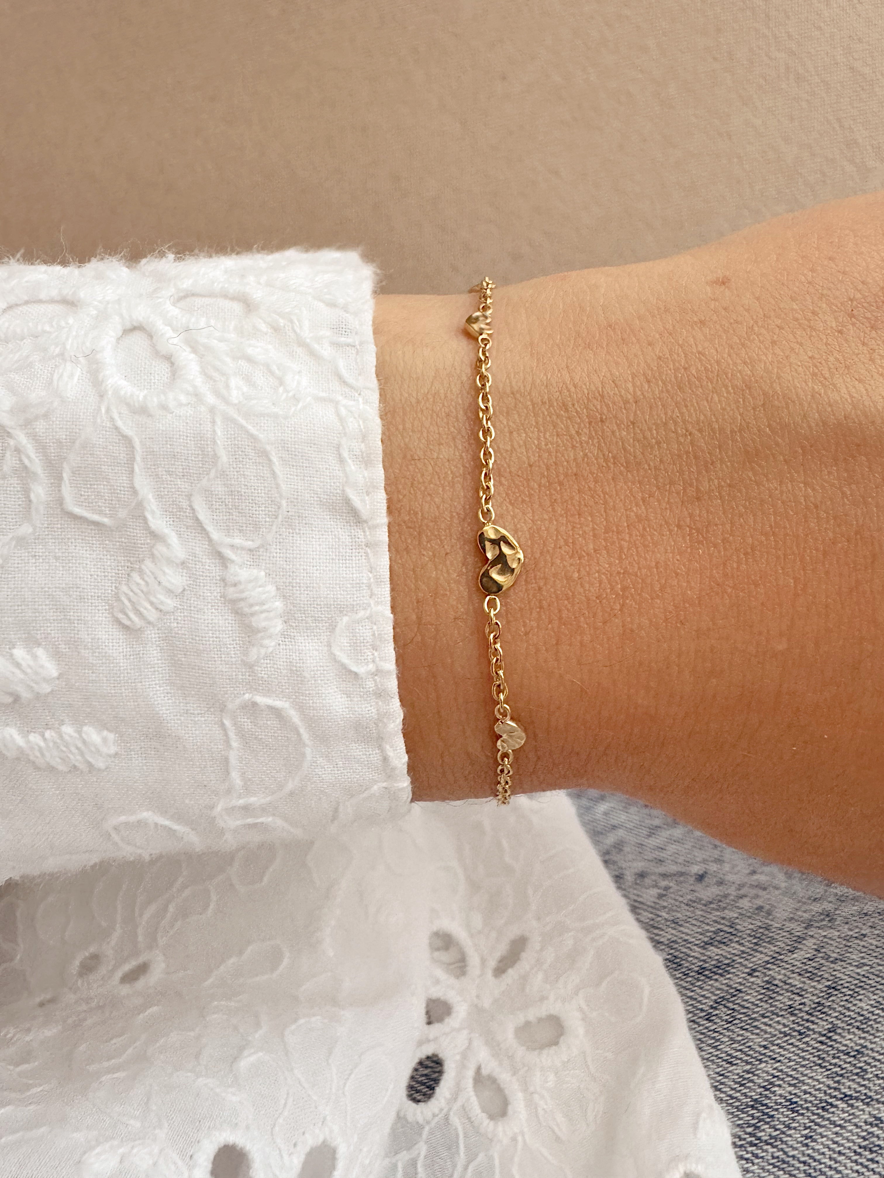 - Bracelet sur chaîne en acier inoxydable composé de pastilles en forme de petits coeurs martelés.