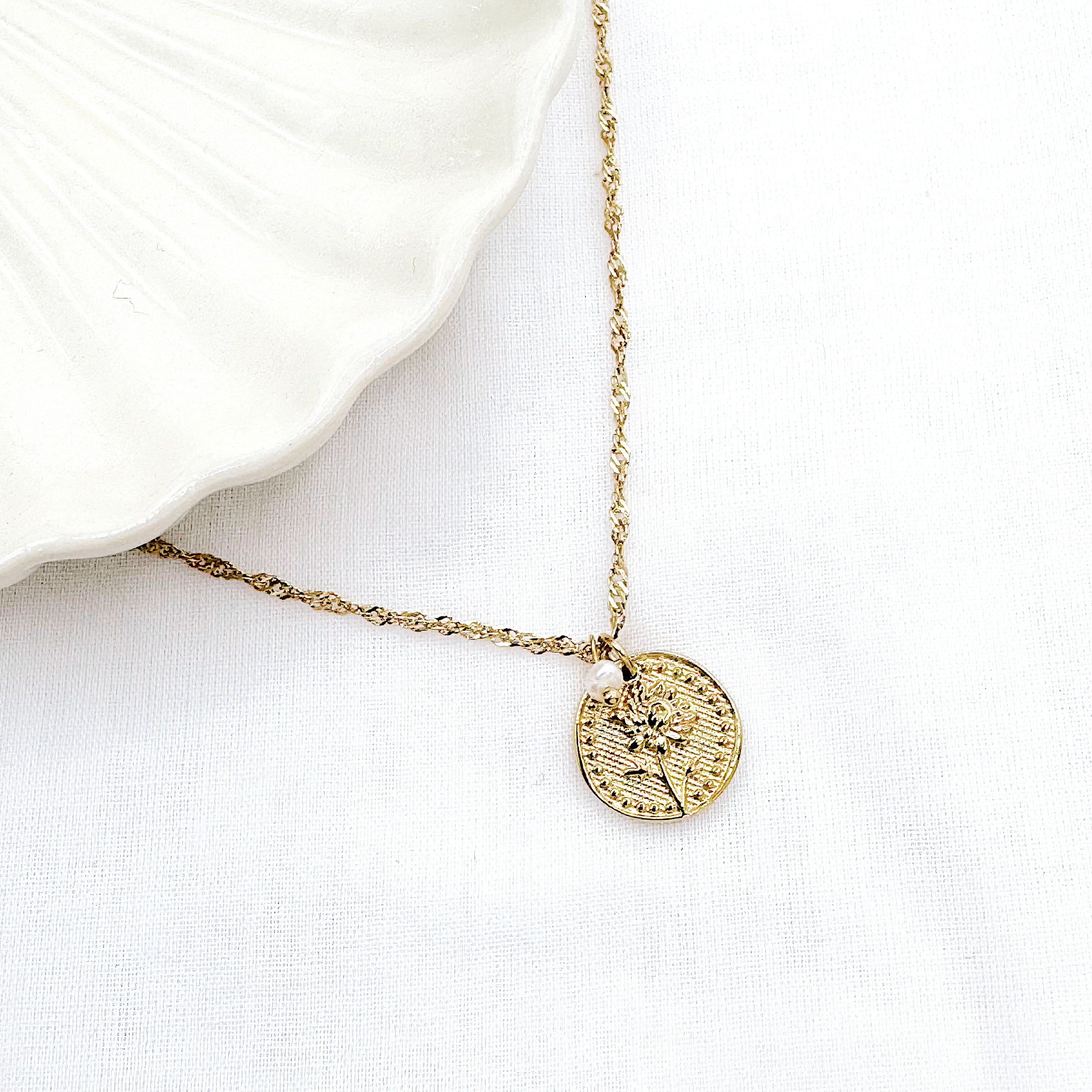 - Collier en acier inoxydable orné d'une perle d'eau douce et d'un petit pendentif fleur