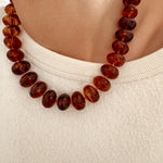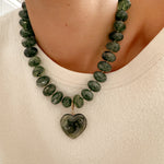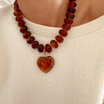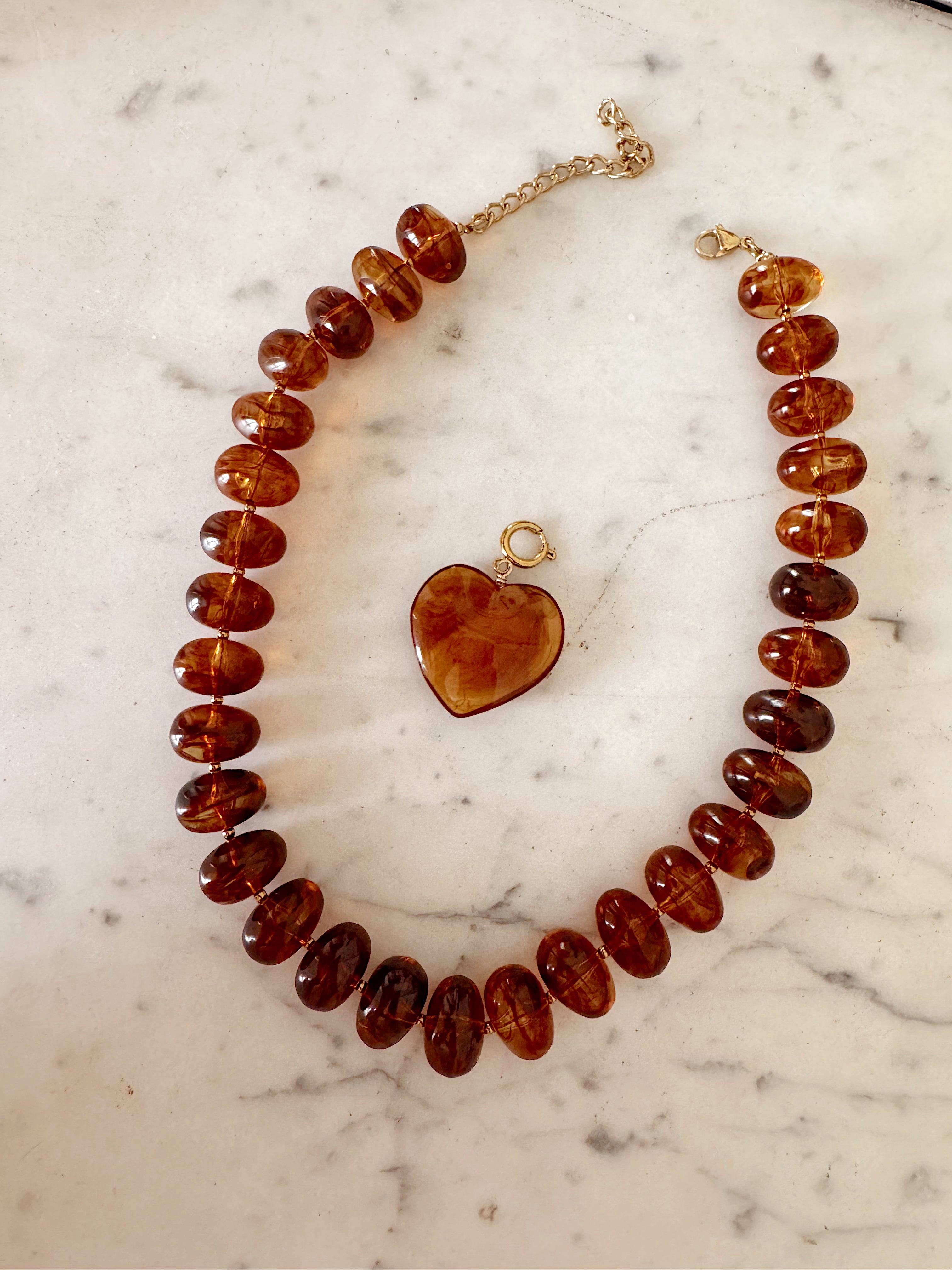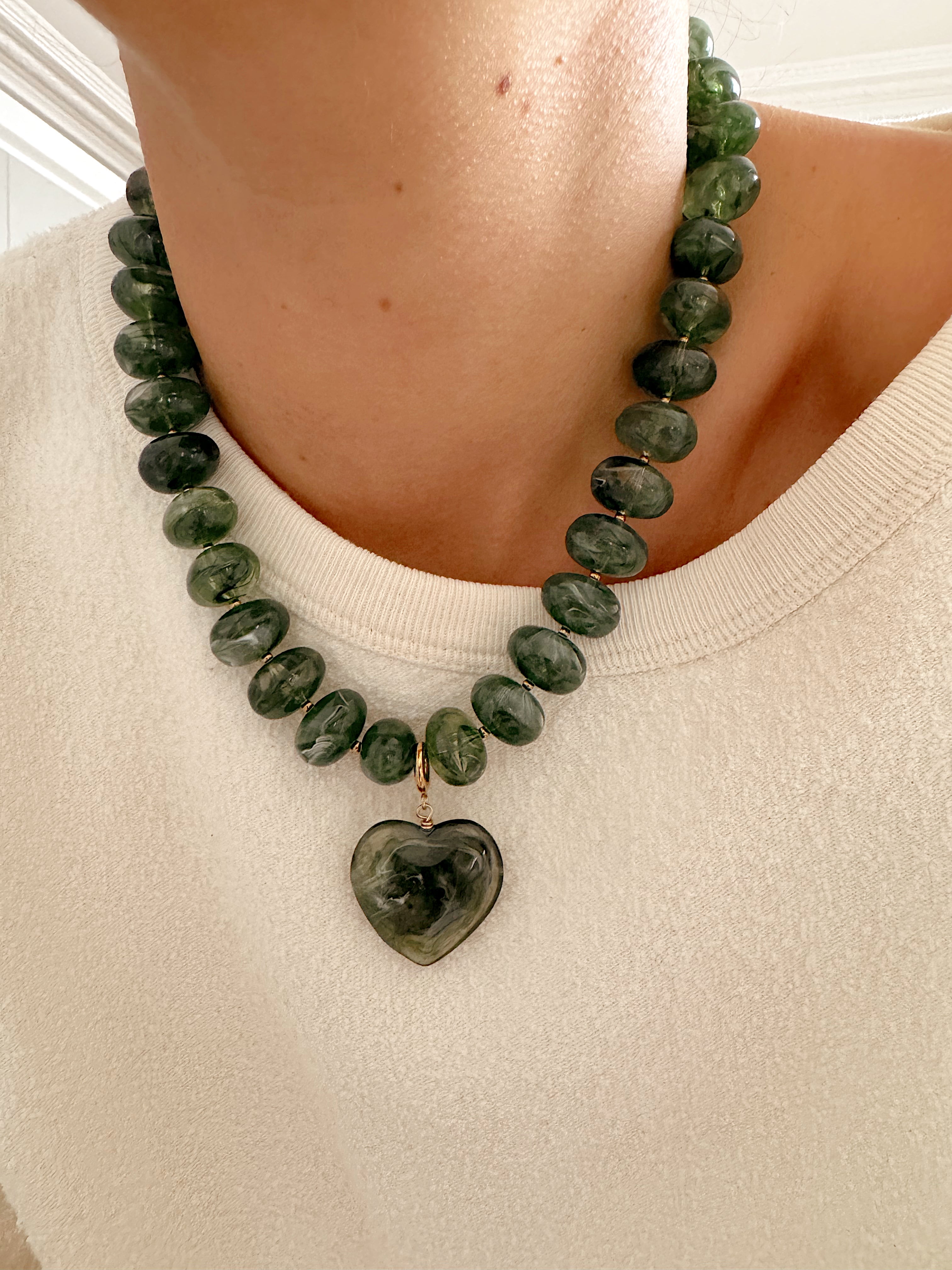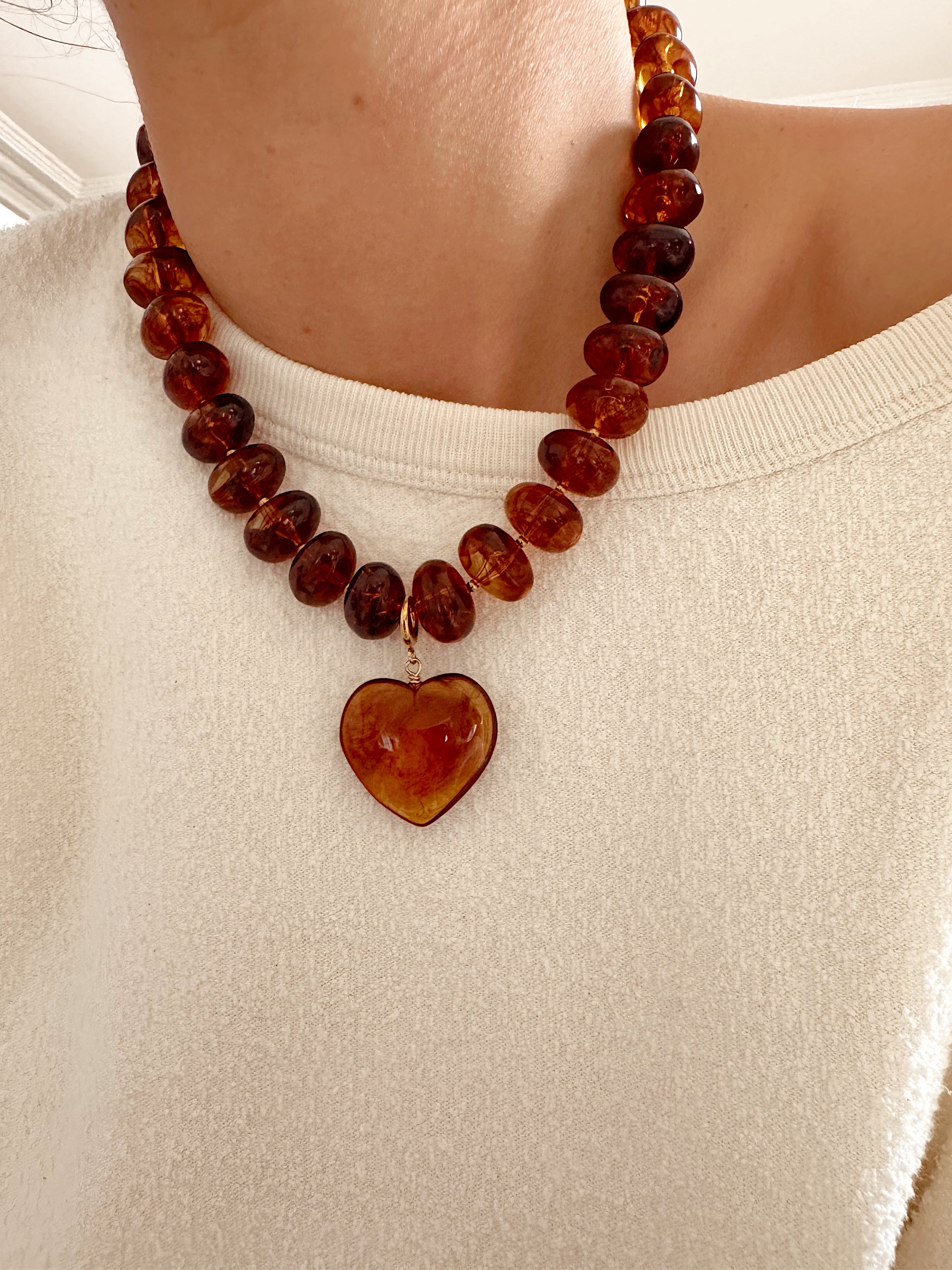 - Collier sur cordon composé de grosses perles en résine colorée et d'un pendentif amovible en forme de coeur en résine.