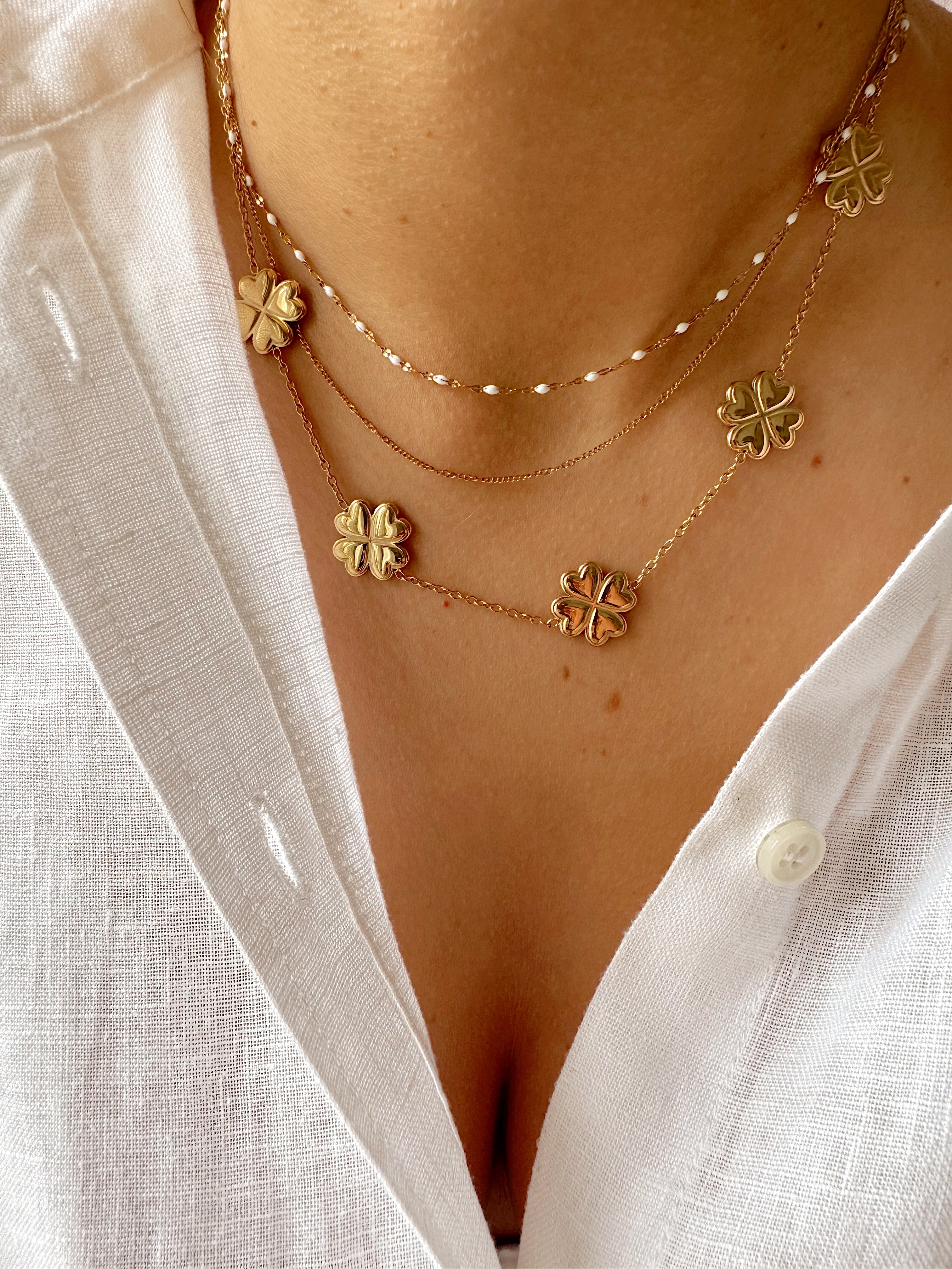 - Collier sur chaîne en acier inoxydable composé de trèfles.
