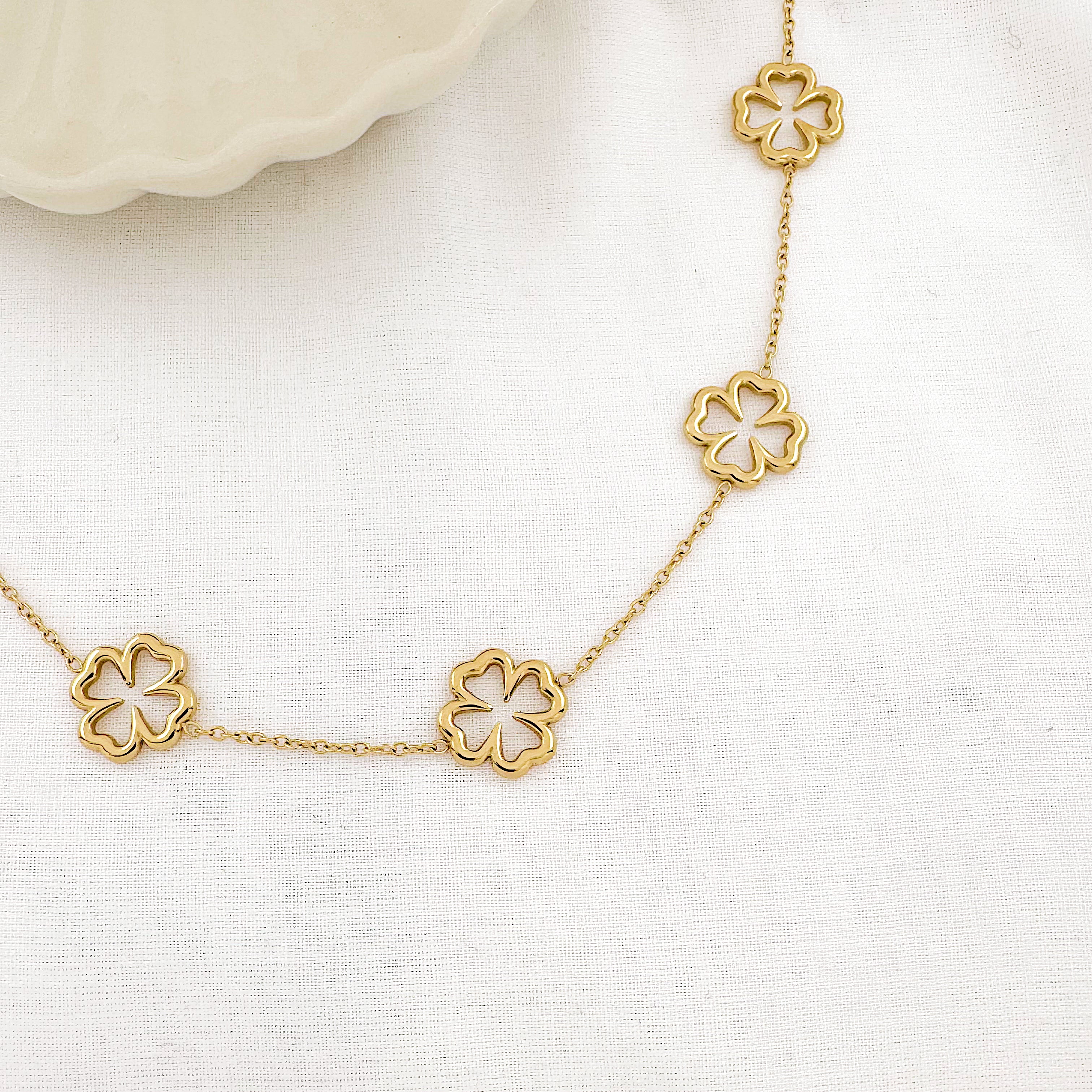 - Collier sur chaîne en acier inoxydable composé de trèfles ajourés.