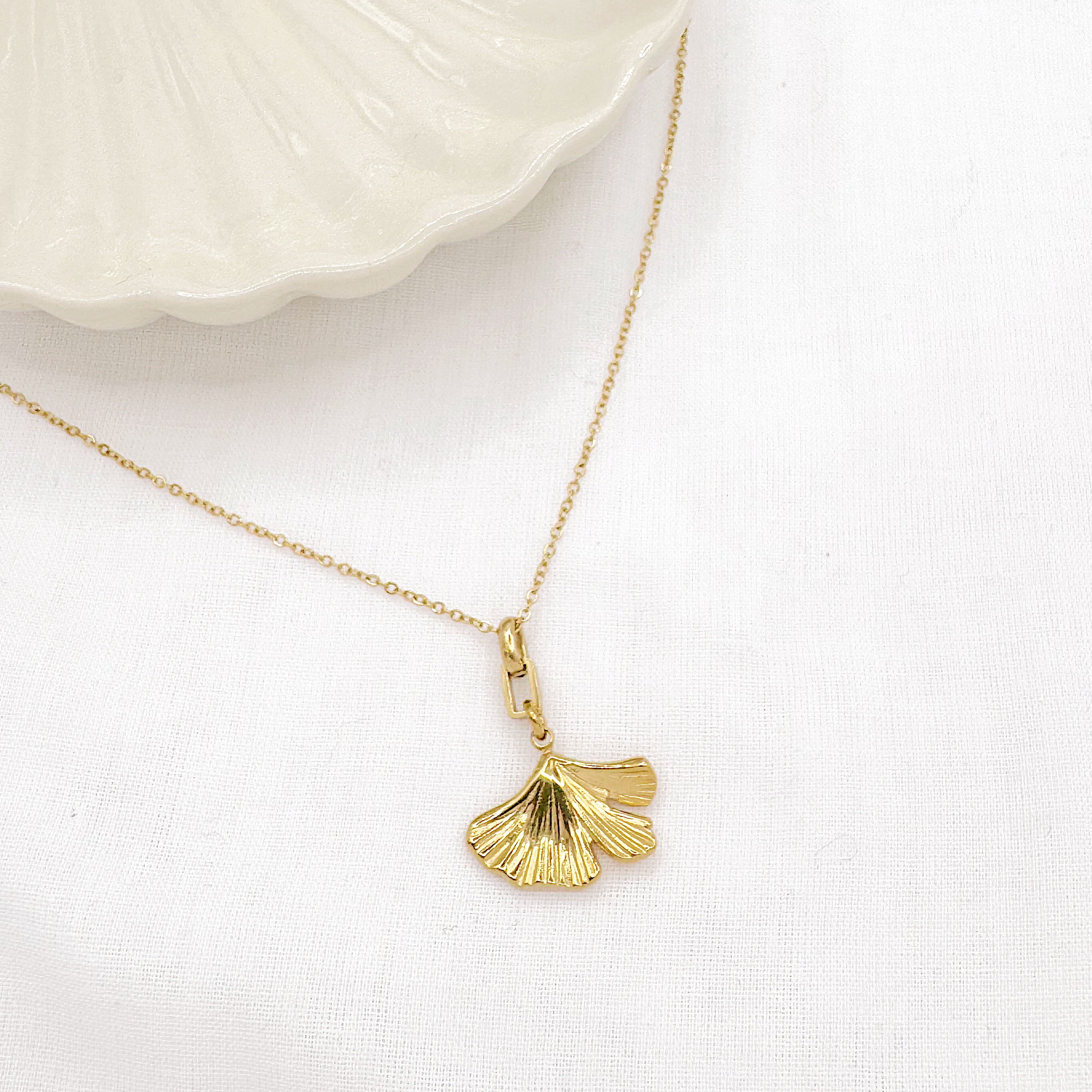 - Collier e, acier inoxydable sur chaîne composé d'une pampille forme feuille de ginkgo. Fermoir mousqueton et chaînette réglable.