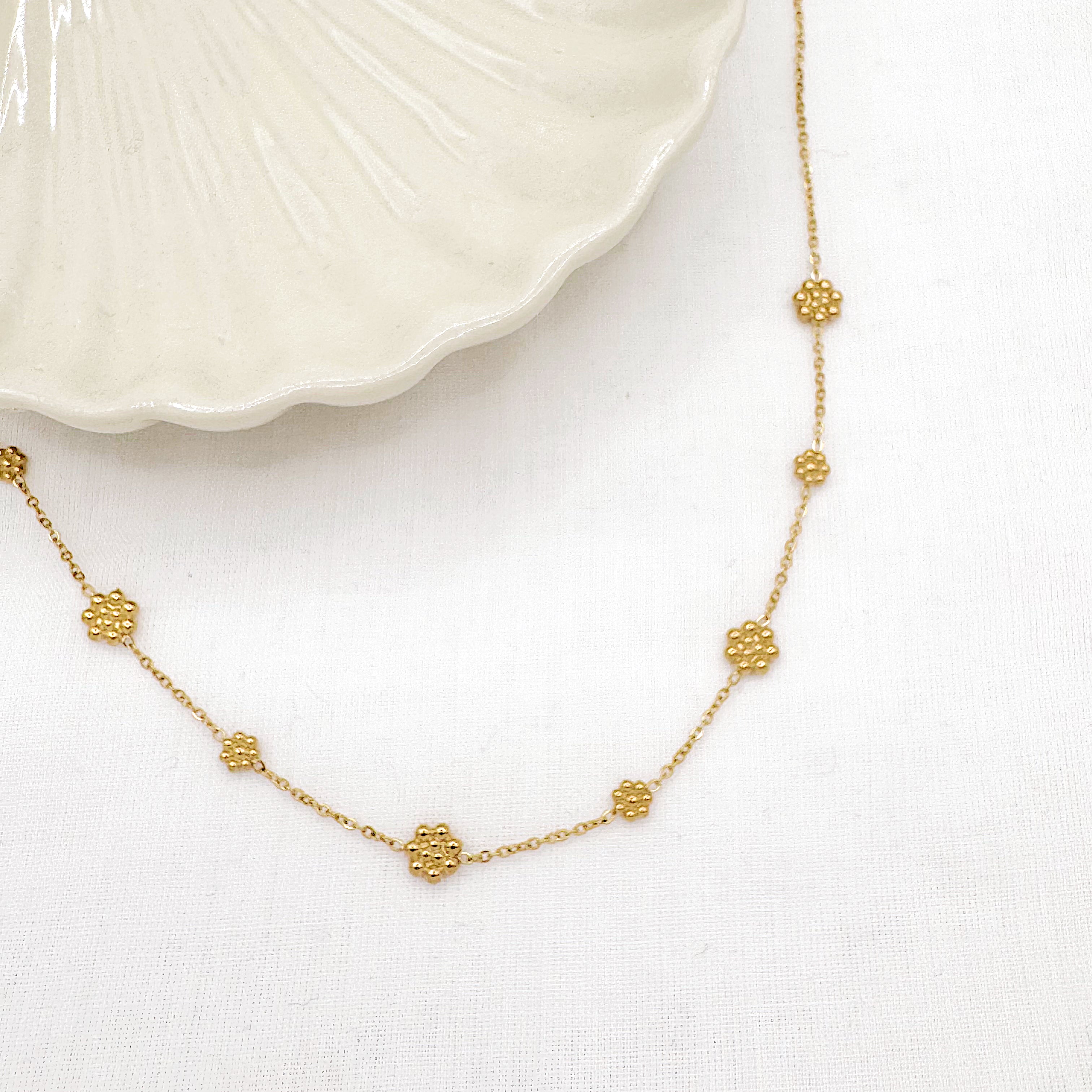 - Collier sur chaîne en acier inoxydable composé de petites fleurs.