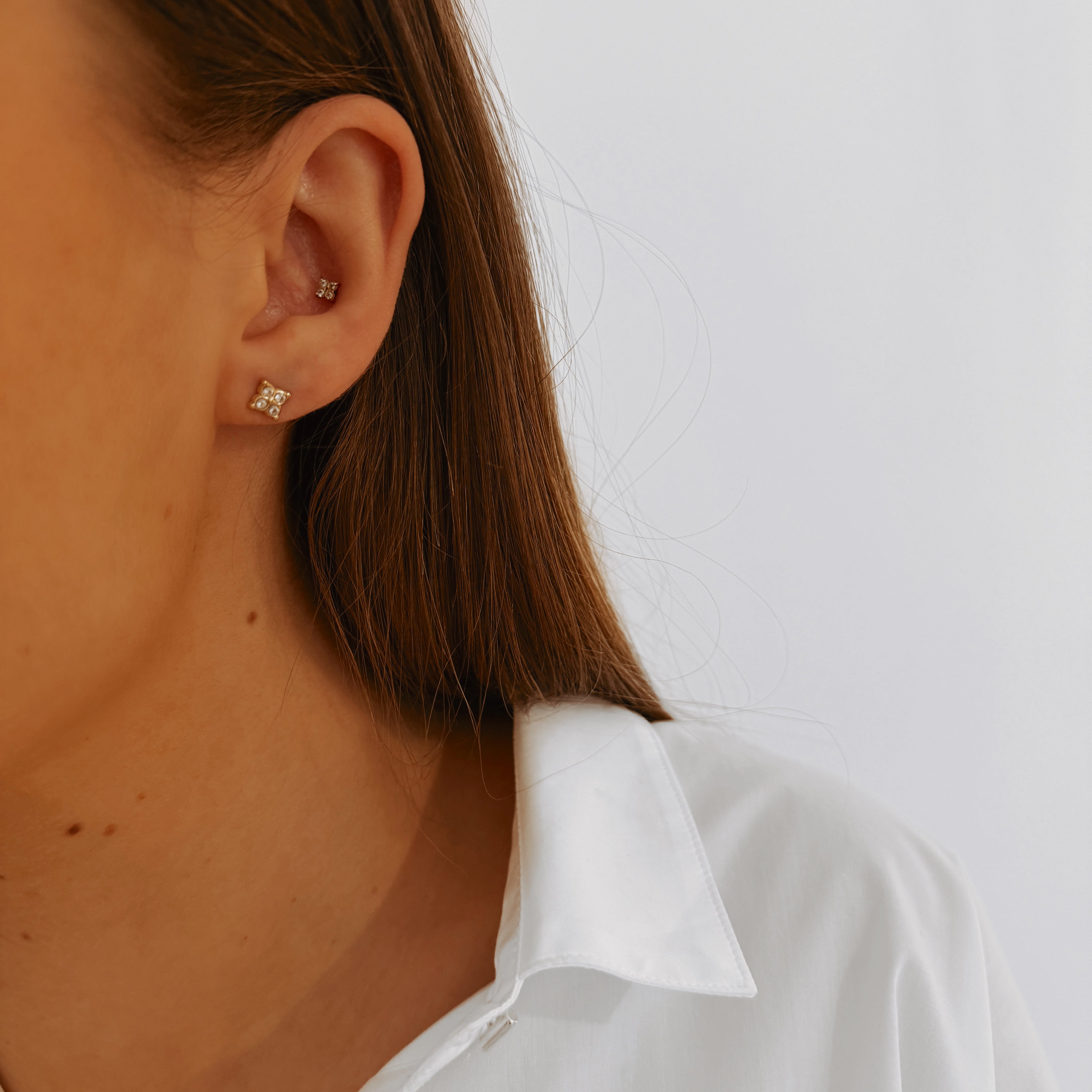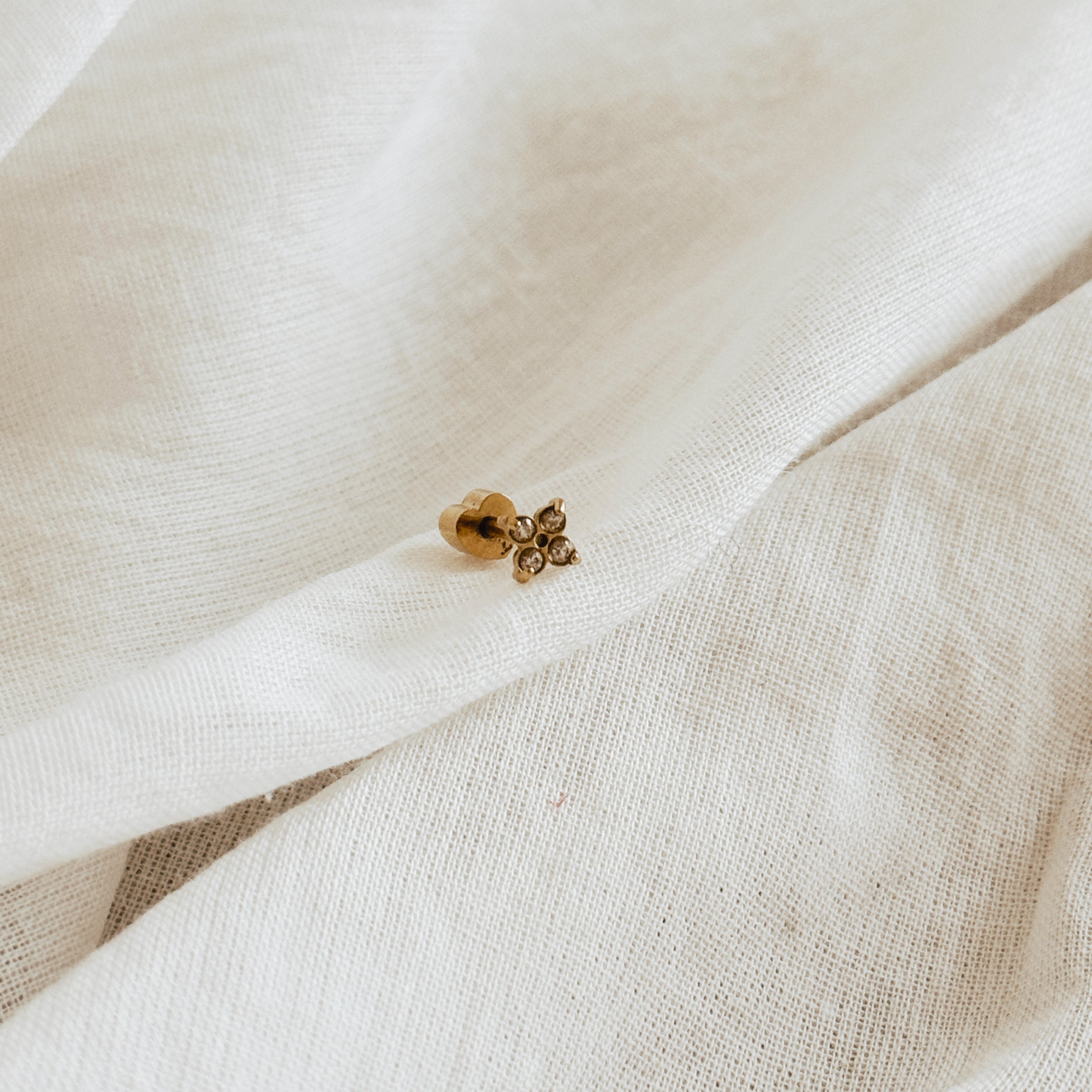 - Piercing en acier inoxydable doré composé d'un motif trèfle à 4 feuilles orné d'oxydes de zirconium avec un fermoir en forme de coeur.