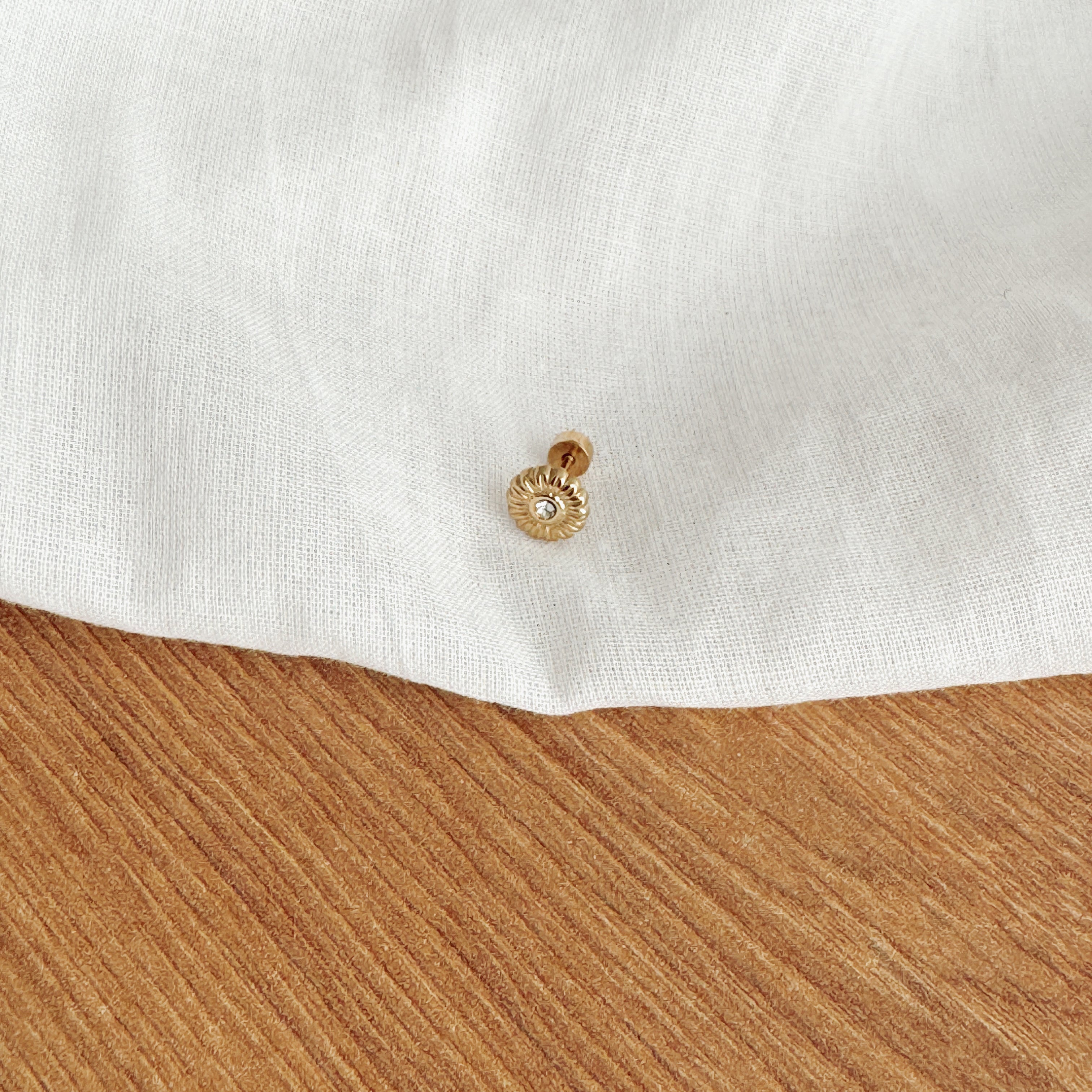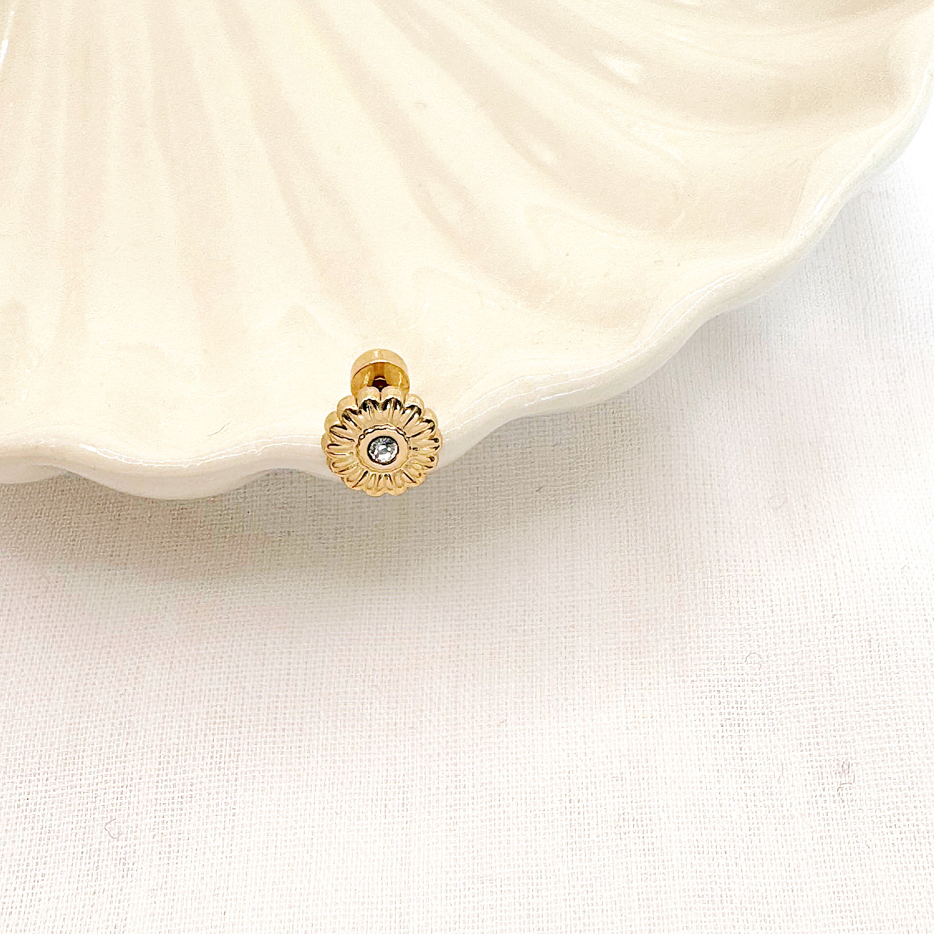 - Boucle d'oreille type piercing en acier inoxydable composée d'une fleur texturée avec un petit cristal.